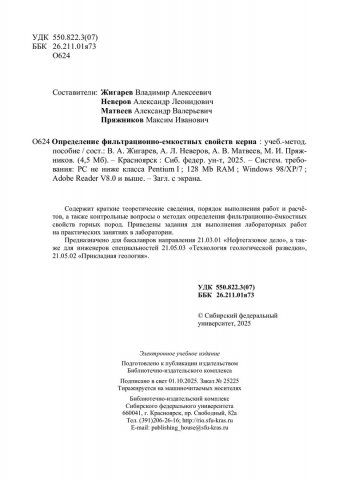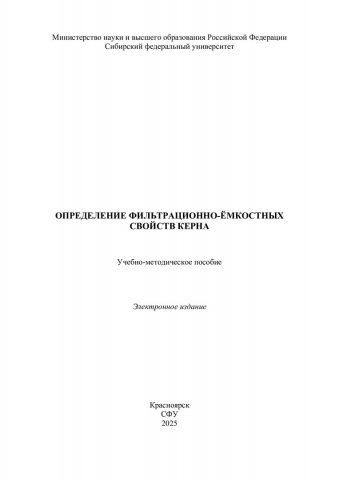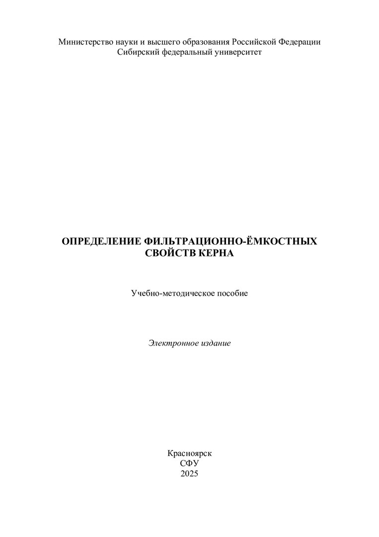 Библиографическое описание: Определение фильтрационно-емкостных свойств керна : учебно-методическое пособие / Сибирский федеральный университет, Институт нефти и газа ; сост.: В. А. Жигарев, А. Л. Неверов, А. В. Матвеев, М. И. Пряжников. - Электрон. текстовые дан. (pdf, 6.1 Мб). - Красноярск : СФУ, 2025 (2025-10-01). - 23 с. - Загл. с титул. экрана. - Библиогр.: с. 23. - Изд. № 2025-25225 : Б. ц. - Текст : электронный.