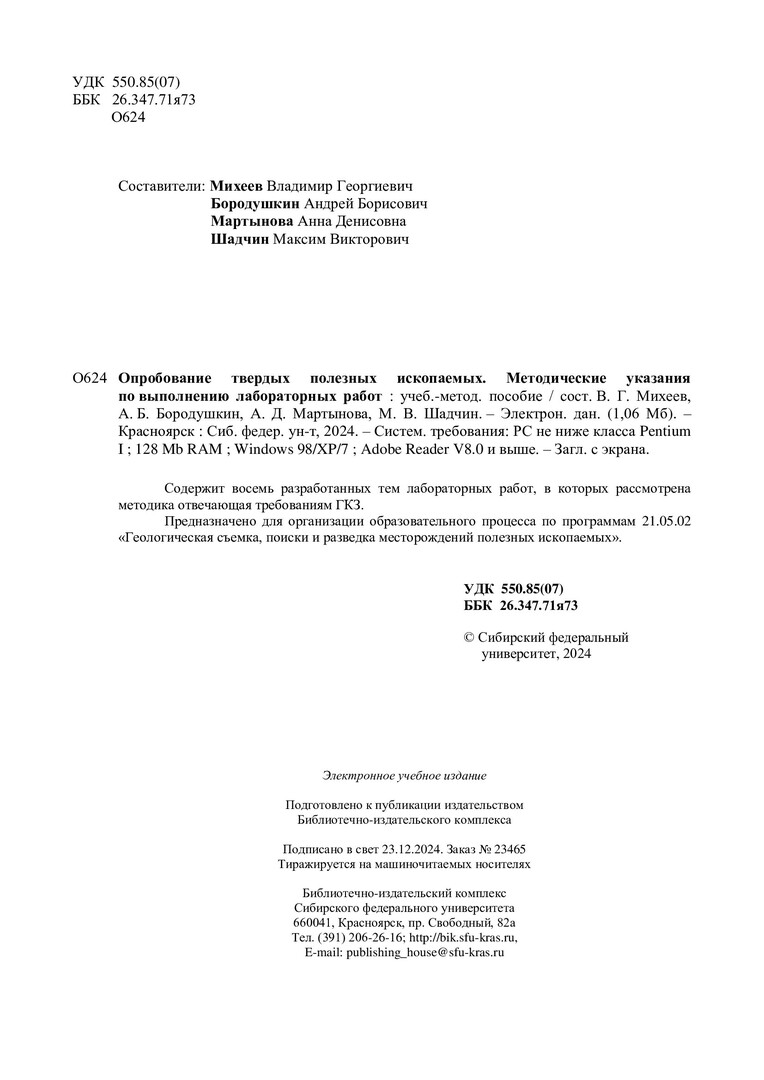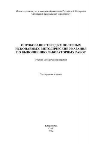 Библиографическое описание:Опробование твердых полезных ископаемых : методические указания по выполнению лабораторных работ: учебно-методическое пособие / Сибирский федеральный университет, Институт цветных металлов ; сост. В. Г. Михеев, А. Б. Бородушкин, А. Д. Мартынова, М. В. Шадчин. - Электрон. текстовые дан. (pdf, 1,1 Мб). - Красноярск : СФУ, 2024 (2024-12-23). - 41 с. - Загл. с титул. экрана. - Изд. № 2024-23465 : Б. ц. - Текст : электронный.
