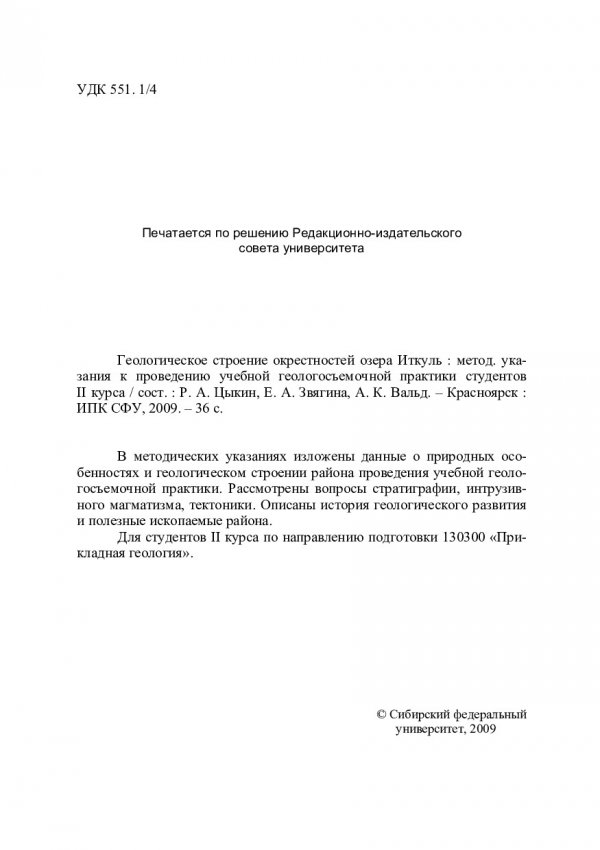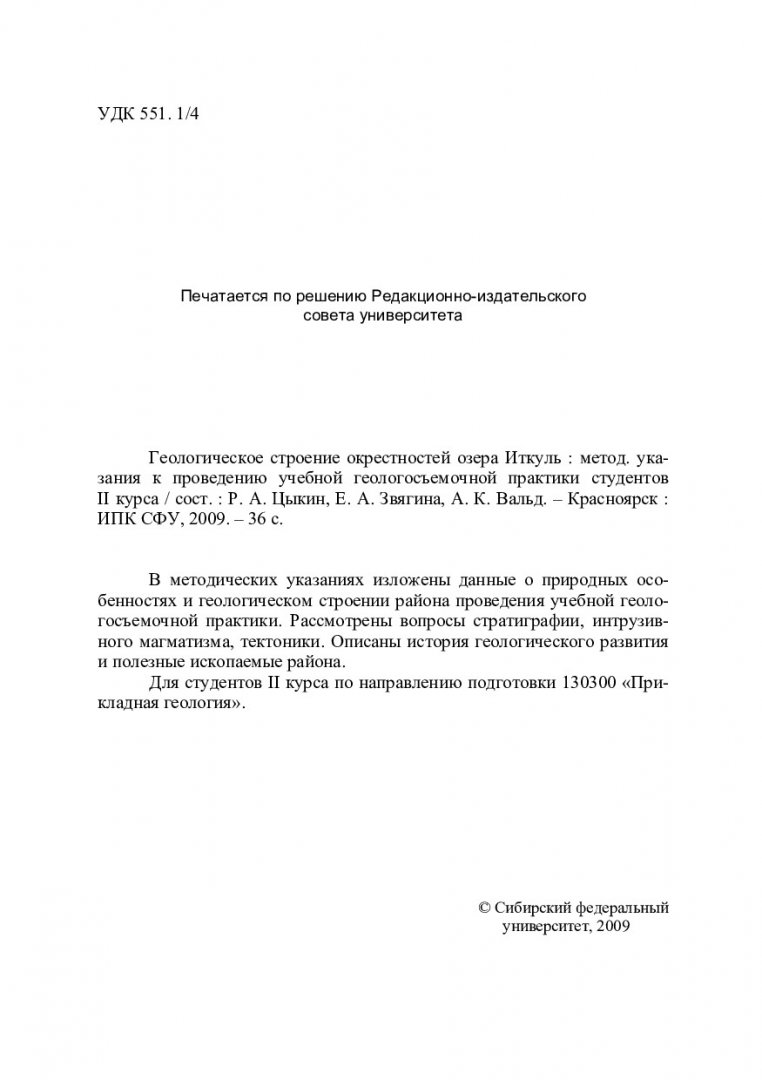Библиографическое описание:Геологическое строение окрестностей озера Иткуль : методические указания к проведению учебной геологосъемочной практики студентов II курса / Сибирский федеральный университет [СФУ] ; сост.: Р. А. Цыкин, Е. А. Звягина, А. К. Вальд. - Красноярск : Информационно-полиграфический комплекс [ИПК] СФУ, 2009. - 35 с. : рис. - Библиогр. список: с.34. - 18.00 р. - Текст : непосредственный + Текст : электронный.