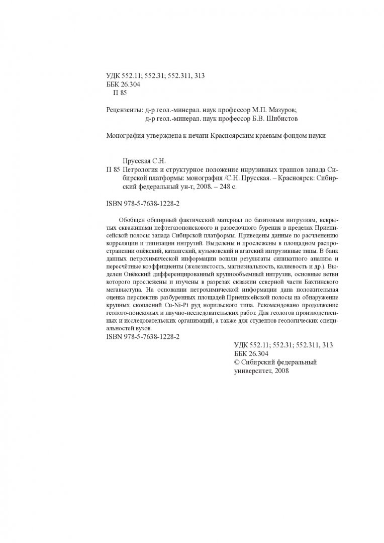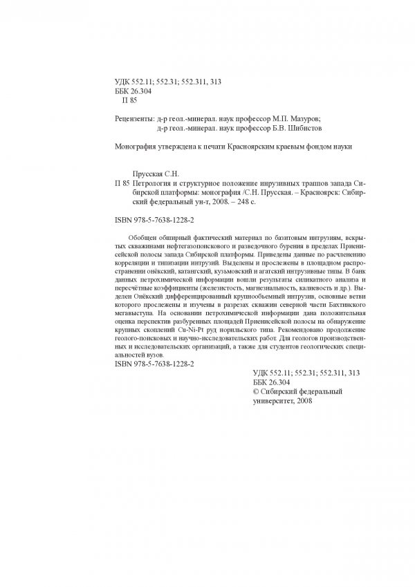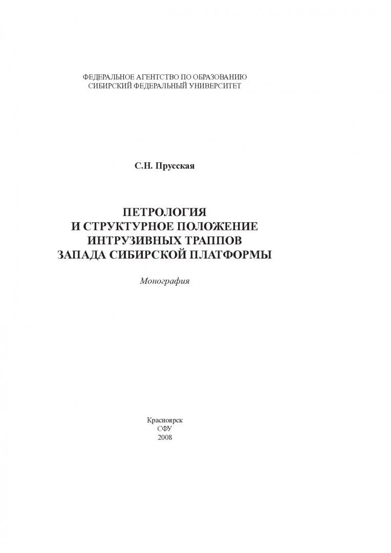 Библиографическое описание:Прусская, Светлана Никифоровна. Петрология и структурное положение интрузивных траппов запада Сибирской платформы : монография / С. Н. Прусская. - Красноярск : Сибирский федеральный университет [СФУ], 2008. - 247 с. : ил. - (Библиотека журнала СФУ. Техника и технологии). - Список лит.: с.144-158. - ISBN 978-5-7638-1228-2 : 245 р. - Текст : непосредственный + Текст : электронный. Режим доступа: читальные залы НБ СФУ