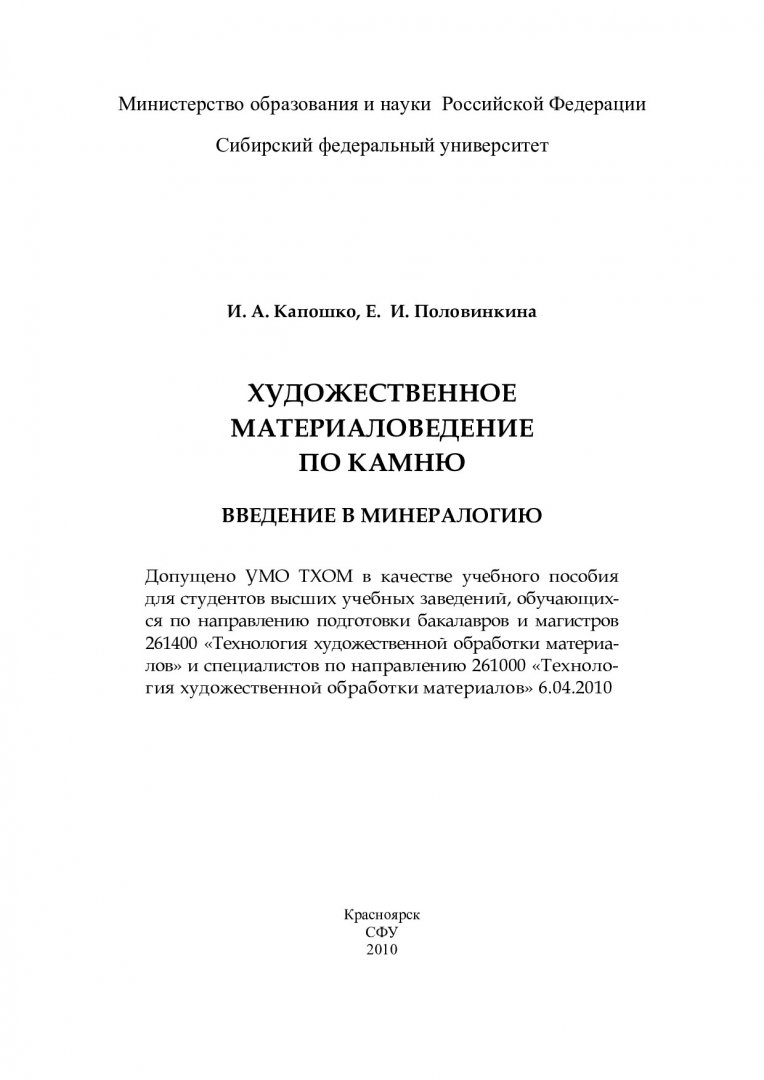 Библиографическое описание: Капошко, Инга Анатольевна. Художественное материаловедение по камню. Введение в минералогию : учебное пособие для студентов вузов / И. А. Капошко, Е. И. Половинкина ; Сиб. федерал. ун-т. - Красноярск : ИПК СФУ, 2010. - 92 с. : ил. - Библиогр.: с. 90. - 100 экз. - ISBN 978-5-7638-2002-7. - Текст : непосредственный + Текст : электронный.