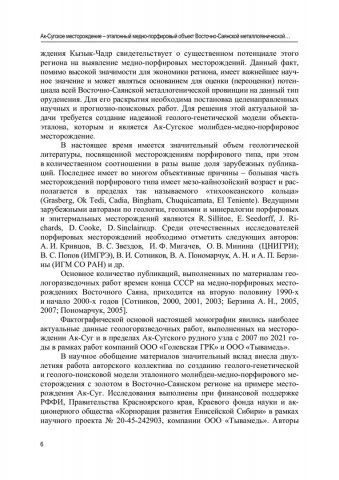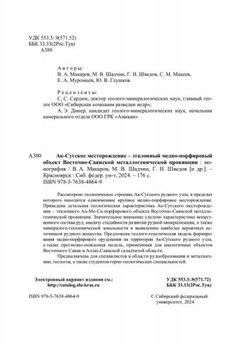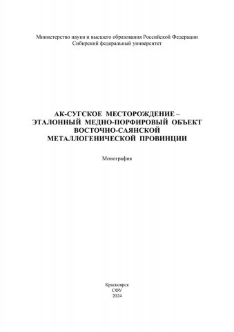Библиографическое описание: Ак-Сугское месторождение - эталонный медно-порфировый объект Восточно-Саянской металлогенической провинции : монография / В. А. Макаров, М. В. Шадчин, Г. И. Шведов [и др.] ; рец.: С. С. Сердюк, А. Э. Динер ; Сибирский федеральный университет, Институт цветных металлов. - Электрон. текстовые дан. (63,2 Мб). - Красноярск : СФУ, 2024 (2024-03-25). - 176 с., 11.0 усл. печ. л. : цв. ил., граф., табл. - Загл. с титул. экрана. - Электрон. версия печ. публикации . - Библиогр.: с. 162-173. - 500 экз. - ISBN 978-5-7638-4864-9 : Б. ц. - Изд. № 2023-19582. - Текст : электронный.