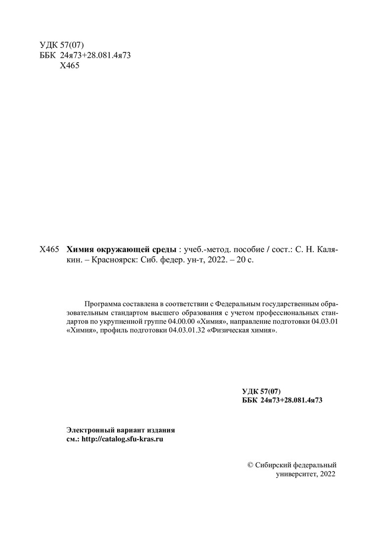 Библиографическое описание: Химия окружающей среды : учебно-методическое пособие / Сибирский федеральный университет, Институт цветных металлов и материаловедения ; сост. С. Н. Калякин. - Электрон. текстовые дан. (1,1 Мб). - Красноярск : СФУ, 2022 (2022-08-08). - 20 с. : табл. - Загл. с титул. экрана. - Электрон. версия печ. публикации . - Библиогр.: с. 14-16. - 100 экз. - Изд. № 2022-16863 : Б. ц. - Текст : электронный.