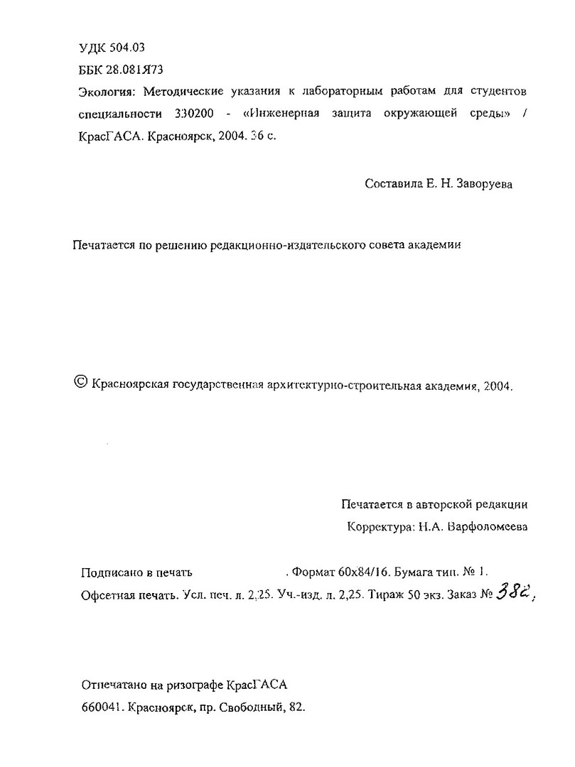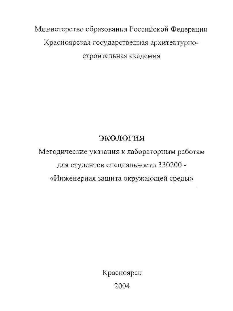 Библиографическое описание:Экология : методические указания к лабораторным работам для студентов спец. 330200 "Инженерная защита окружающей среды" / Краснояр. гос. архит.-строит. акад. ; сост. Е. Н. Заворуева. - Красноярск : КрасГАСА, 2004. - 36 с. : рис. - Библиогр.: с. 34-35