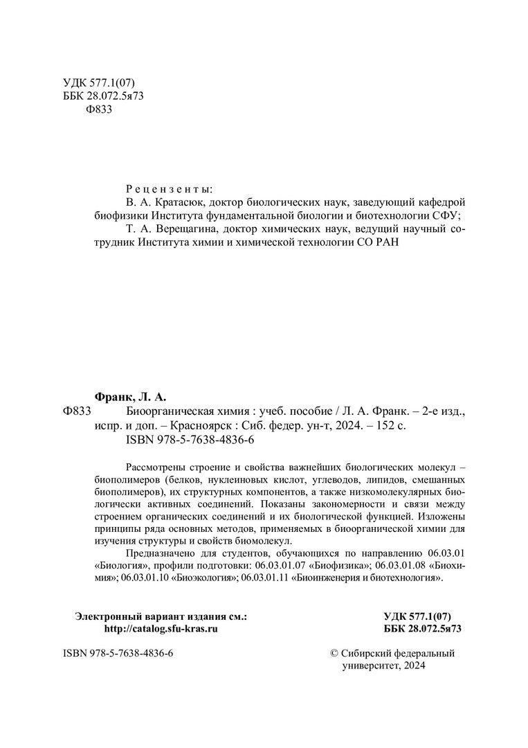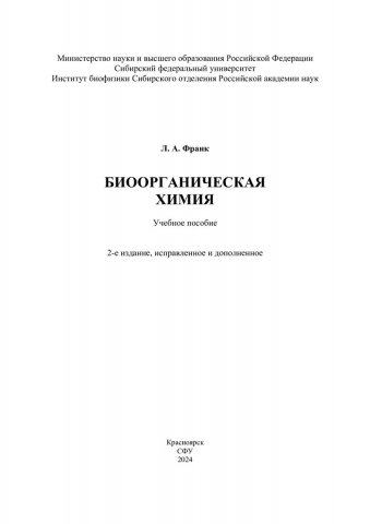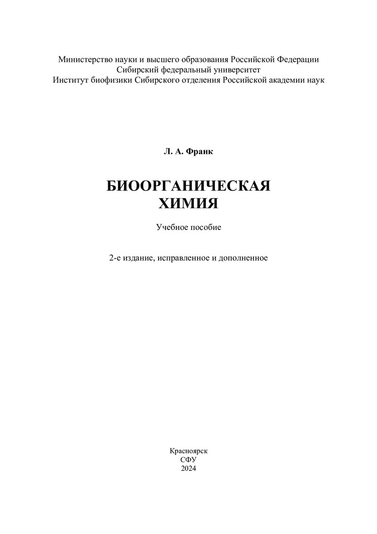 Библиографическое описание: Франк, Людмила Алексеевна. Биоорганическая химия : учебное пособие / Л. А. Франк ; рец.: В. А. Кратасюк, Т. А. Верещагина ; Сибирский федеральный университет, Институт фундаментальной биологии и биотехнологии. - 2-е изд., испр. и доп. - Электрон. текстовые дан. (17,8 Мб). - Красноярск : СФУ, 2024 (2024-01-15). - 152 с., 9.5 усл. печ. л. - Загл. с титул. экрана. - Электрон. версия печ. публикации . - Библиогр. в конце глав. - 100 экз. - ISBN 978-5-7638-4836-6 : Б. ц. - Изд. № 2023-18794. - Текст : электронный.