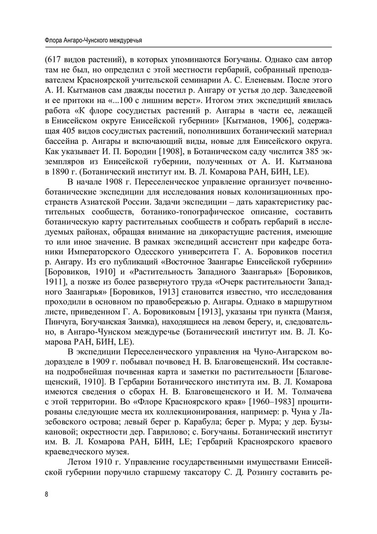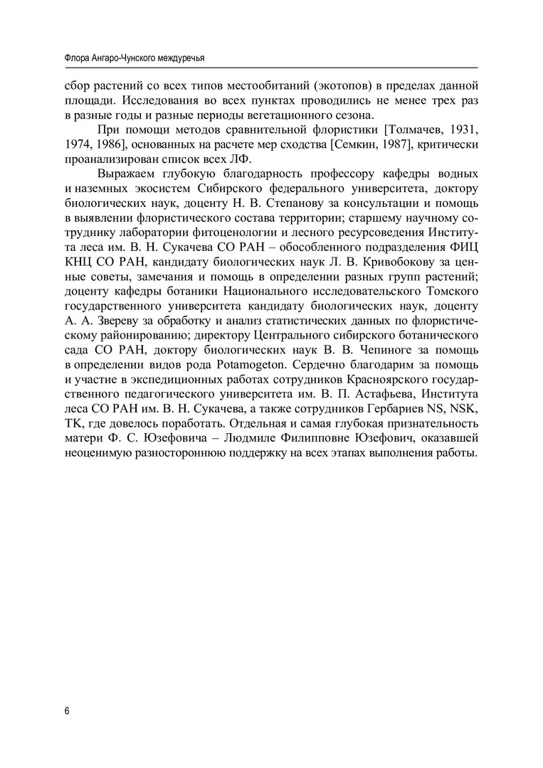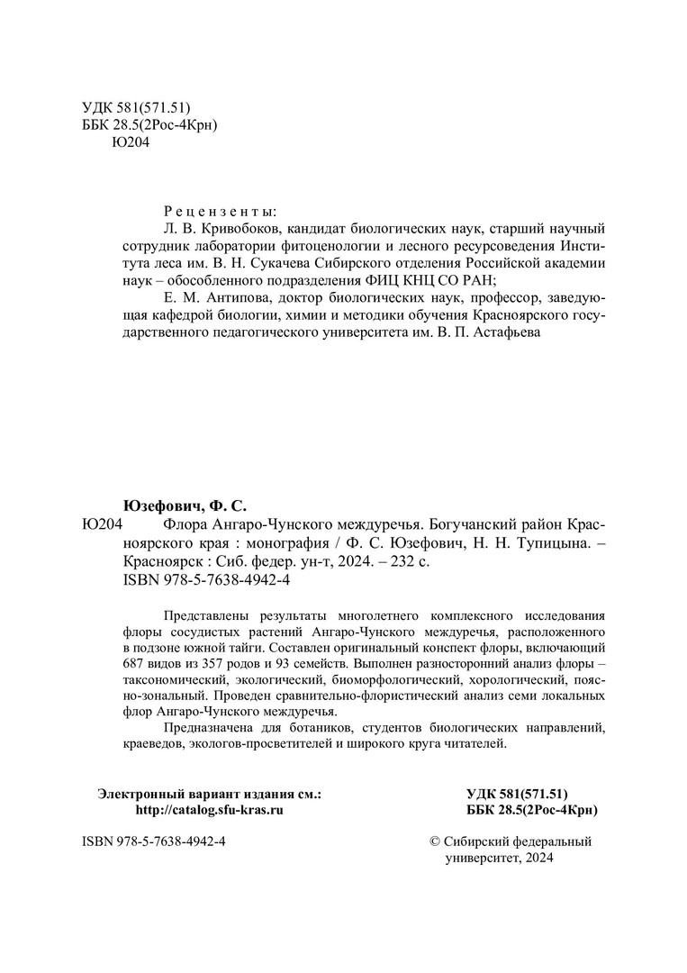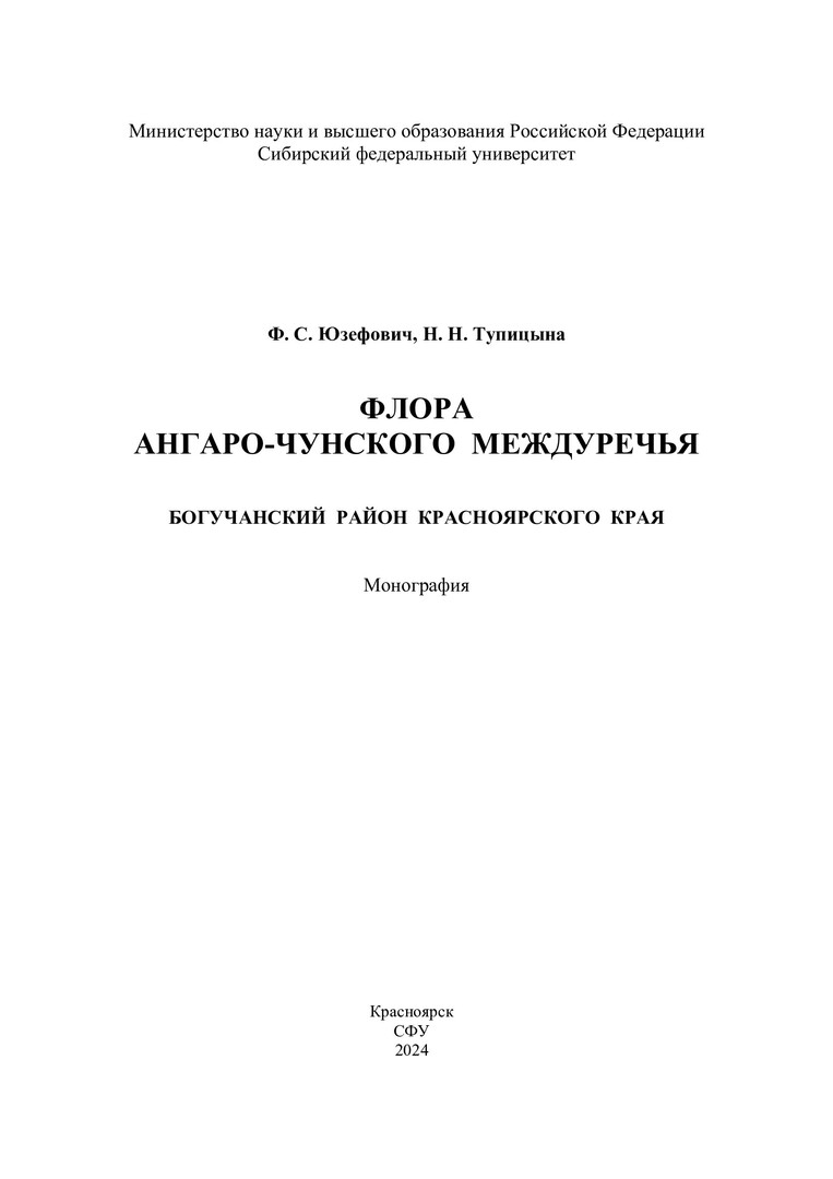 Библиографическое описание: Юзефович, Филипп Сергеевич. Флора Ангаро-Чунского междуречья (Богучанский район Красноярского края) : монография / Ф. С. Юзефович, Н. Н. Тупицына ; рец.: Л. В. Кривобоков, Е. М. Антипова ; Сибирский федеральный университет, Институт фундаментальной биологии и биотехнологии. - Электрон. текстовые дан. (16,2 Мб). - Красноярск : СФУ, 2024 (2024-11-18). - 232 с., 14.5 усл. печ. л. : цв. ил., табл. - Загл. с титул. экрана. - Электрон. версия печ. публикации . - Библиогр.: с. 205-220. - 500 экз. - ISBN 978-5-7638-4942-4 : Б. ц. - Изд. № 2023-20852. - Текст : электронный.