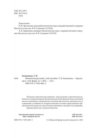 Библиографическое описание: Голованова, Тамара Ивановна. Физиология растений : учебное пособие / Т. И. Голованова ; Сибирский федеральный университет, Институт фундаментальной биологии и биотехнологии. - Электрон. текстовые дан. (1,9 Мб). - Красноярск : СФУ, 2022 (2022-11-29). - 124 с., 7.8 усл. печ. л. : ил., табл. - Загл. с титул. экрана. - Электрон. версия печ. публикации . - Библиогр.: с. 113-114. - 100 экз. - ISBN 978-5-7638-4681-2 : Б. ц. - Изд. № 2022-16141. - Текст : электронный.
