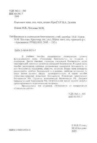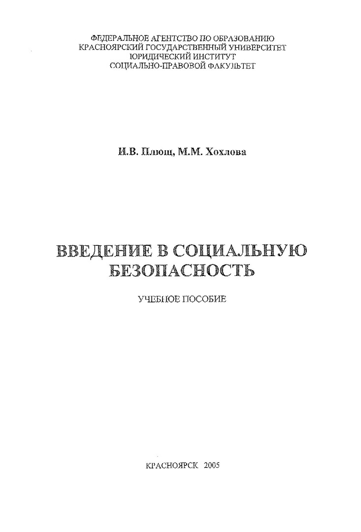Библиографическое описание:Плющ, Ирина Владимировна. Введение в социальную безопасность : учебное пособие / И. В. Плющ, М. М. Хохлова ; Красноярский университет [КрасГУ]. Юридический институт [ЮИ]. - Красноярск : Красноярский университет [КрасГУ], 2005. - 131 с. - ISBN 5-9604002-4-3 : 51 р. - Текст : непосредственный + Текст : электронный. Режим доступа: читальные залы НБ СФУ