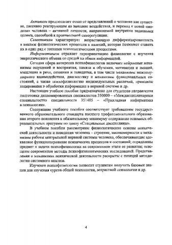 Ключевые слова: психофизиология, сенсорные сигналы, память, обучение, психофизиологические процессы, моторные функции, управление движением (физиолог.), структура мозга, бессознательное, ассоциации, сознание, сон, активность, поведение, нервная система, темперамент, способности познавательные, профессиональный отбор, работоспособность, учебные пособия, рекомендовано сибрумц