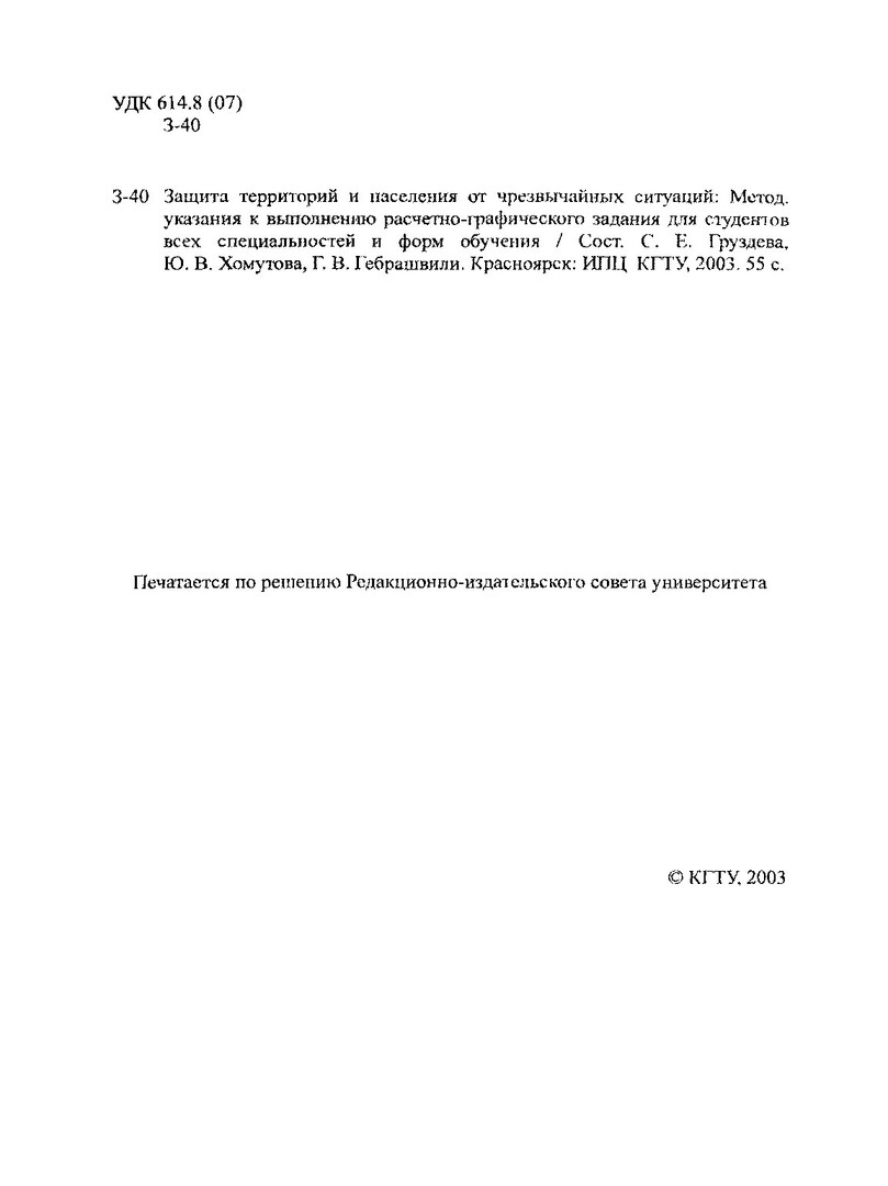 Библиографическое описание:Груздева, Светлана Егоровна. Защита территорий и населения от чрезвычайных ситуаций : метод. указ. по выполнению расчетно-граф. задания для студентов всех спец. / С. Е. Груздева , Ю. В. Хомутова, Г. В. Гебрашвили ; Краснояр. гос. техн. ун-т. - Красноярск : ИПЦ КГТУ, 2003. - 55 с. - Текст : непосредственный + Текст : электронный.