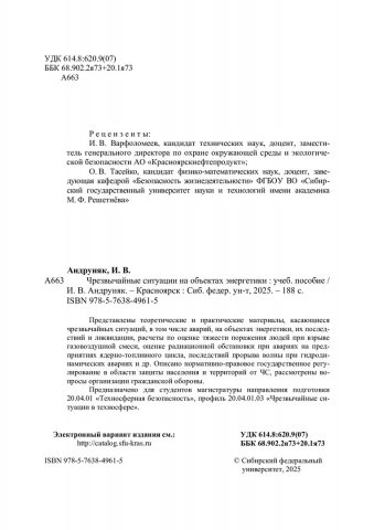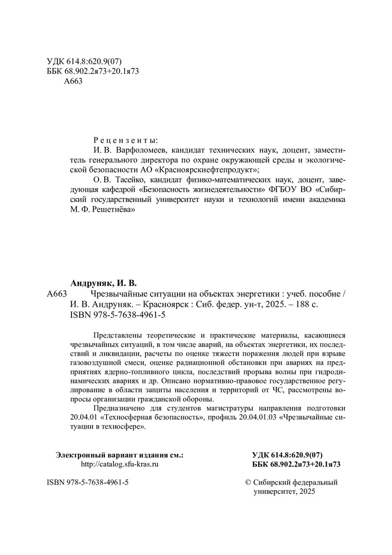Библиографическое описание: Андруняк, Ирина Васильевна. Чрезвычайные ситуации на объектах энергетики : учебное пособие / И. В. Андруняк ; рец.: И. В. Варфоломеев, О. В. Тасейко ; Сибирский федеральный университет, Политехнический институт. - Электрон. текстовые дан. (pdf ; 4,3 Мб). - Красноярск : СФУ, 2025 (2025-05-06). - 188 с., 11.8 усл. печ. л. : табл., схемы. - Загл. с титул. экрана. - Электрон. версия печ. публикации . - Библиогр.: с. 180-184. - 100 экз. - ISBN 978-5-7638-4961-5 : Б. ц. - Изд. № 2024-21274. - Текст : электронный.