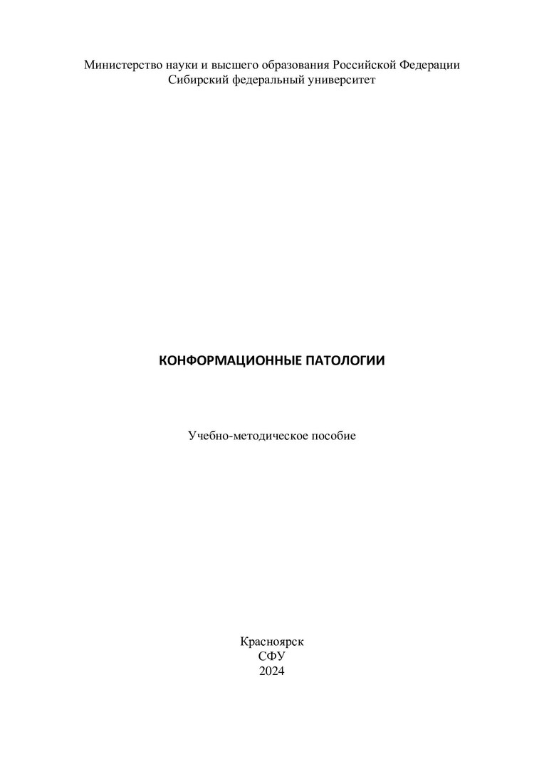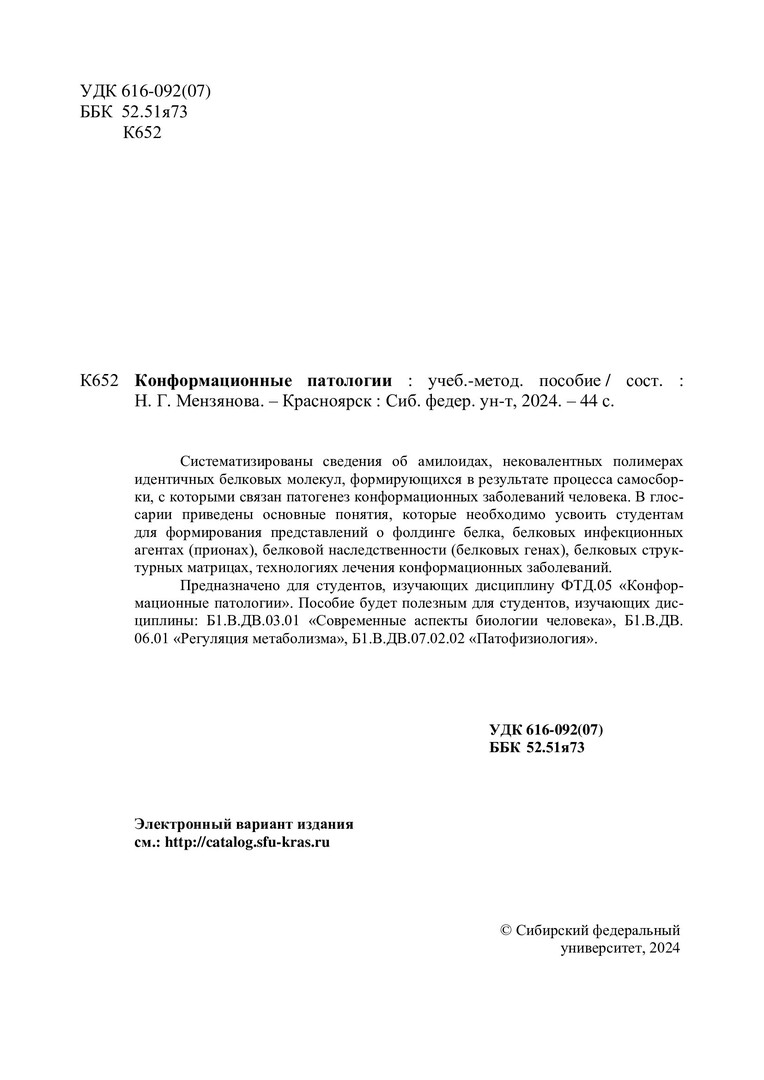 Библиографическое описание: Конформационные патологии : учебно-методическое пособие / Сибирский федеральный университет, Институт фундаментальной биологии и биотехнологии ; сост. Н. Г. Мензянова. - Красноярск : СФУ, 2024 (2024-04-15). - 44 с. - 100 экз. - Изд. № 2024-21452 : 146.00 р. - Текст : непосредственный + Текст : электронный.