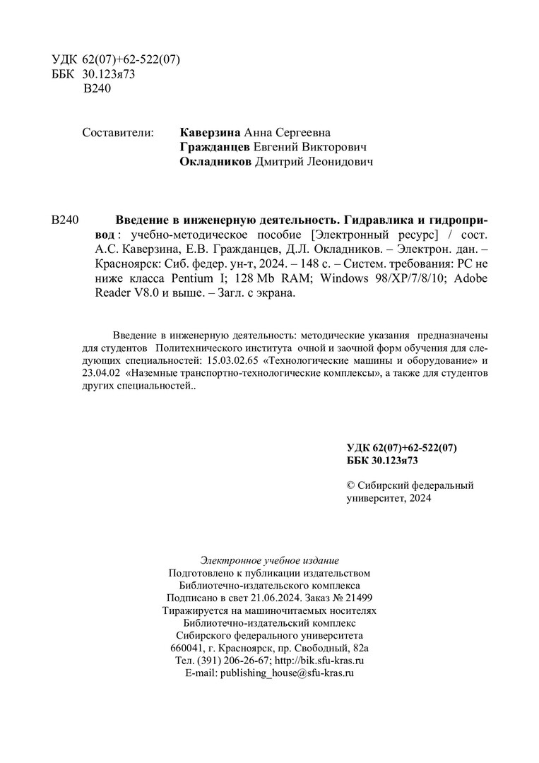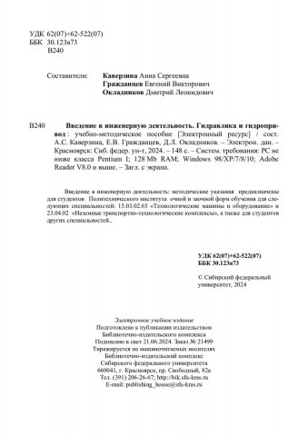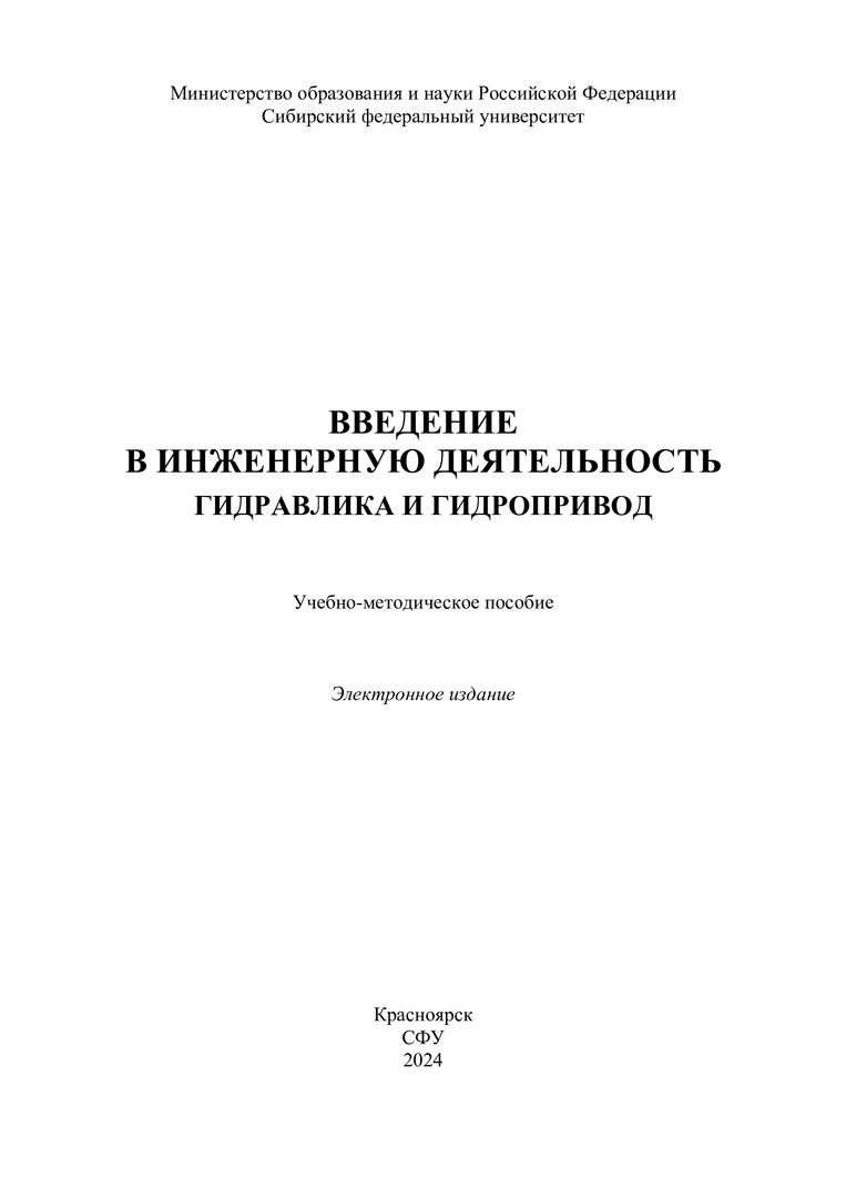 Библиографическое описание:Введение в инженерную деятельность. Гидравлика и гидропривод : учебно-методическое пособие / Сиб. федер. ун-т, Политехн. ин-т ; сост.: А. С. Каверзина, Е. В. Гражданцев, Д. Л. Окладников. - Электрон. текстовые дан. (pdf, 23,7 Мб). - Красноярск : СФУ, 2024. - 148 с. - Загл. с титул. экрана. - Изд. № 2024-21499 : Б. ц. - Текст : электронный.