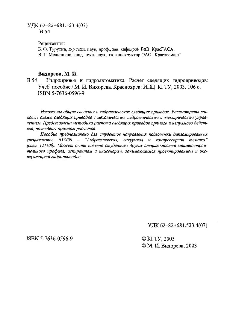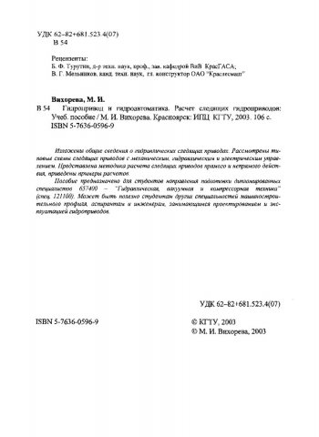 Библиографическое описание: Вихорева, Маргарита Ивановна. Гидропривод и гидроавтоматика. Расчет следящих гидроприводов : учеб. пособие / М. И. Вихорева ; Краснояр. гос. техн. ун-т. - Красноярск : ИПЦ КГТУ, 2003. - 106 с. - ISBN 5-7636-0596-9. - Текст : непосредственный + Текст : электронный.