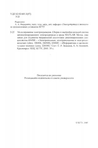 Библиографическое описание:Залялеев, Сергей Равильевич. Моделирование электроприводов. Сборка и настройка моделей систем автоматизированного электропривода в среде MATLAB : Метод. указ. для студентов направлений подгот. дипломир. спец., 654600 / С. Р. Залялеев, А. Н. Пахомов ; Краснояр. гос. техн. ун-т. - Красноярск : ИПЦ КГТУ, 2005. - 39 с. - (Учеб.-метод. лит.). - Текст : непосредственный + Текст : электронный.