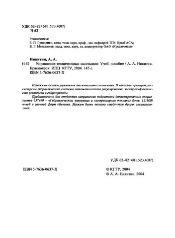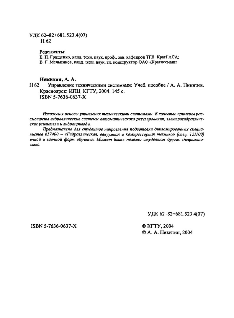 Библиографическое описание: Никитин, Александр Анатольевич. Управление техническими системами : учебное пособие / А. А. Никитин ; Краснояр. гос. техн. ун-т. - Красноярск : ИПЦ КГТУ, 2004. - 145 с. : ил. - Библиогр.: с. 144. - ISBN 5-7636-0637-Х. - Текст : непосредственный + Текст : электронный.