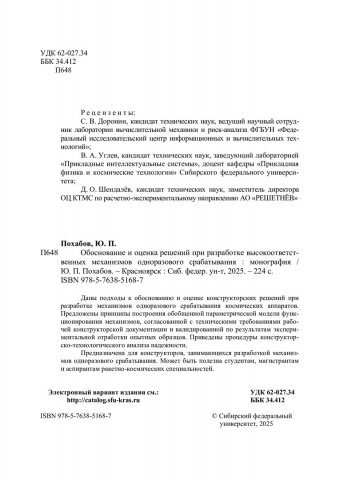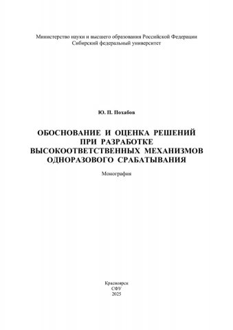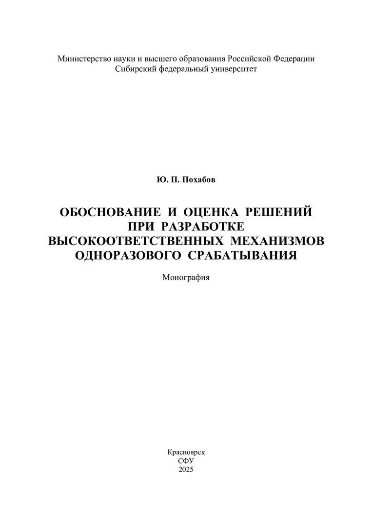 Библиографическое описание: Похабов, Юрий Павлович. Обоснование и оценка решений при разработке высокоответственных механизмов одноразового срабатывания : монография / Ю. П. Похабов ; рец.: С. В. Доронин, В. А. Углев, Д. О. Шендалёв ; Сибирский федеральный университет, Политехнический институт. - Электрон. текстовые дан. (pdf, 5.4 Мб). - Красноярск : СФУ, 2025 (2025-12-03). - 224 с., 14.0 усл. печ. л. - Загл. с титул. экрана. - Электрон. версия печ. публикации . - Библиогр.: с. 204-223. - 500 экз. - ISBN 978-5-7638-5168-7 : Б. ц. - Изд. № 2025-25224. - Текст : электронный.