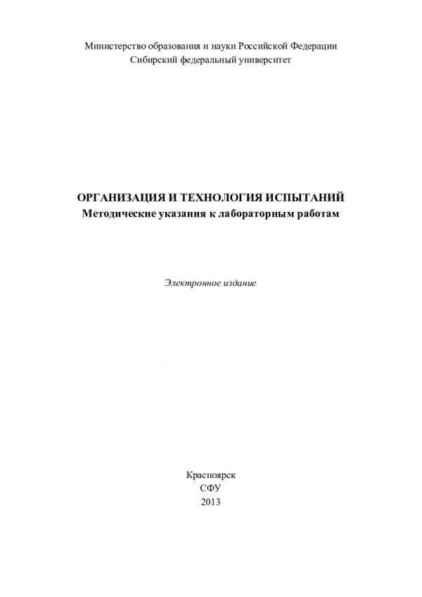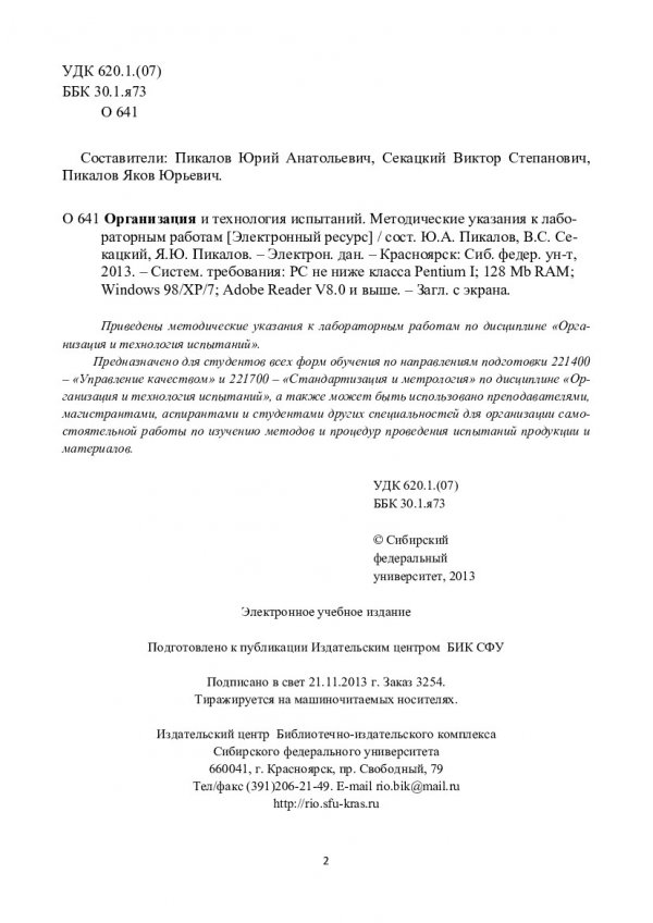 Библиографическое описание:Организация и технология испытаний : методические указания к лабораторным работам [для студентов напр. 221400.62 «Управление качеством», 221700.62 «Стандартизация и метрология»] / Сиб. федерал. ун-т ; сост.: Ю. А. Пикалов, В. С. Секацкий, Я. Ю. Пикалов. - Электрон. текстовые дан. (PDF, 12 Мб). - Красноярск : СФУ, 2013. - Загл. с титул. экрана. - Библиогр.: с. 214-216. - Изд. № 2013-3254. - Текст : электронный.