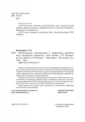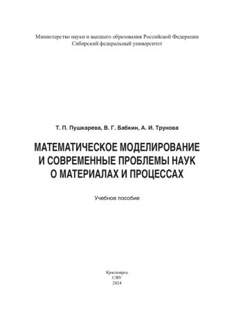 Библиографическое описание: Пушкарева, Татьяна Павловна. Математическое моделирование и современные проблемы наук о материалах и процессах : учебное пособие / Т. П. Пушкарева, В. Г. Бабкин, А. И. Трунова ; рец.: М. М. Клунникова, В. В. Чеглаков ; Сибирский федеральный университет, Политехнический институт. - Электрон. текстовые дан. (6,2 Мб). - Красноярск : СФУ, 2024 (2024-09-09). - 144 с., 9.0 усл. печ. л. : цв. ил., граф., табл. - Загл. с титул. экрана. - Электрон. версия печ. публикации . - Библиогр.: с. 142. - 100 экз. - ISBN 978-5-7638-4811-3 : Б. ц. - Изд. № 2023-18421. - Текст : электронный.