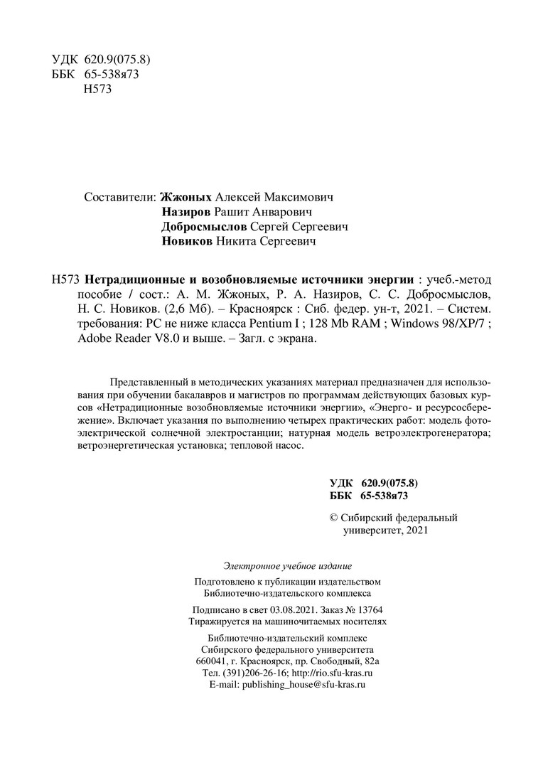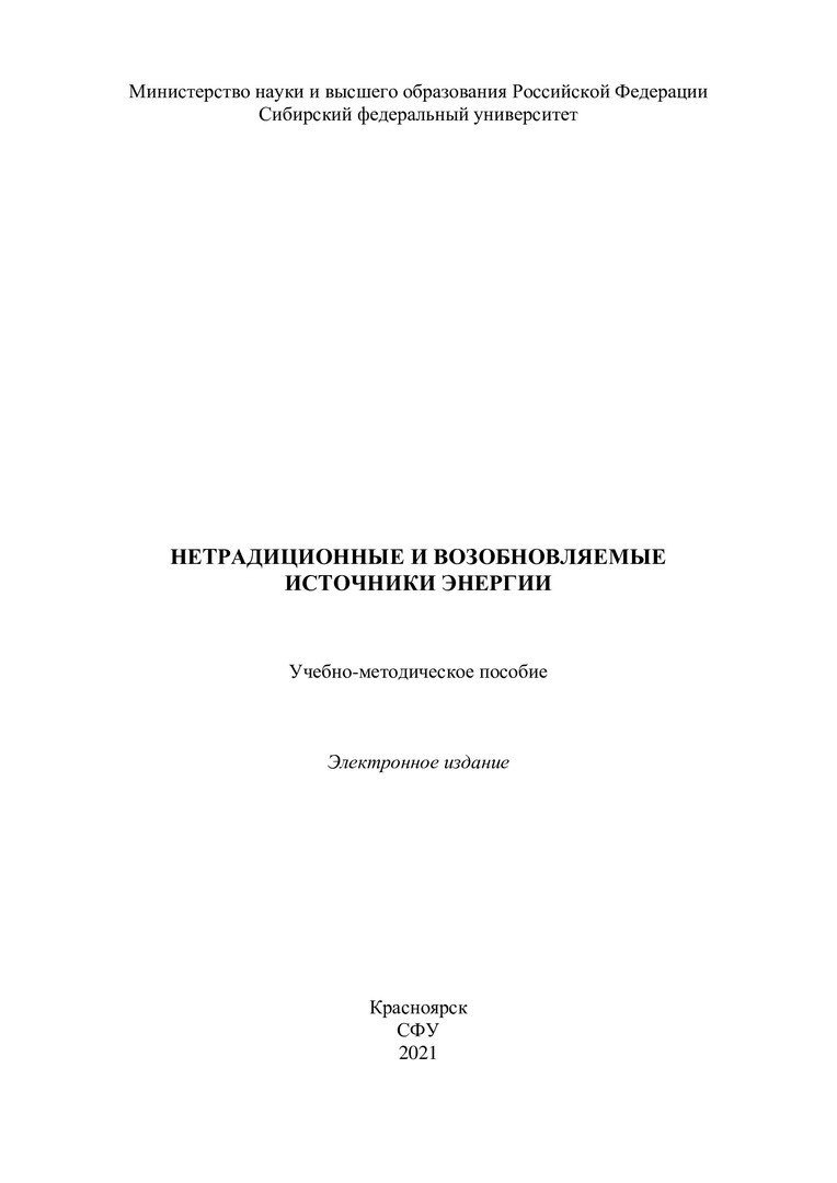 Библиографическое описание: Нетрадиционные и возобновляемые источники энергии : учебно-методическое пособие / Сиб. федер. ун-т, Инж.-строит. ин-т ; сост. А. М. Жжоных [и др.]. - Электрон. текстовые дан. (pdf, 2,7 Мб). - Красноярск : СФУ, 2021 (2021-05-20). - 50 с. - Загл. с титул. экрана. - Изд. № 2021-13764 : Б. ц. - Текст : электронный.