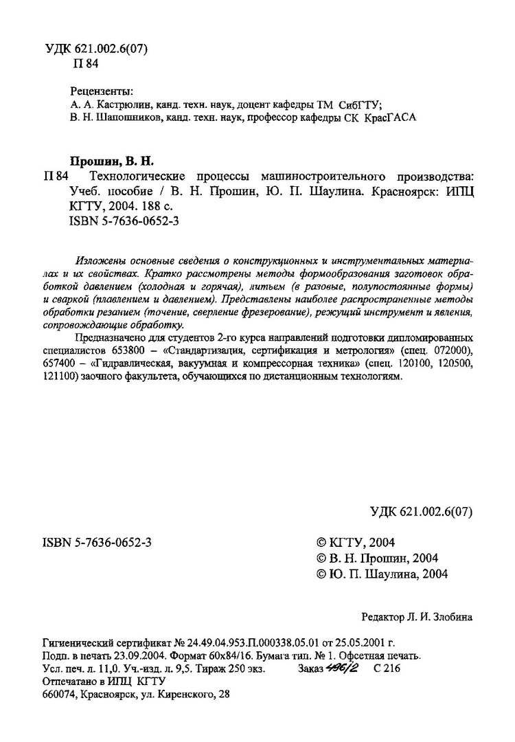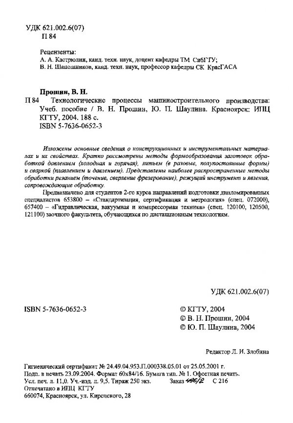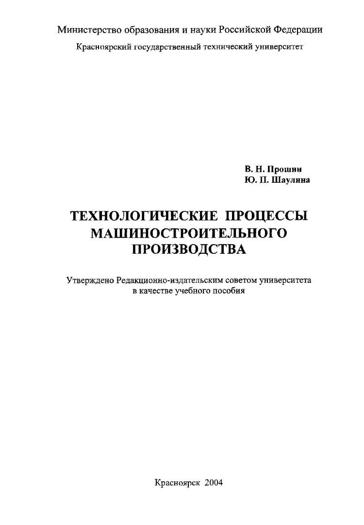 Библиографическое описание: Прошин, Валерий Николаевич. Технологические процессы машиностроительного производства : учеб. пособие / В. Н. Прошин, Ю. П. Шаулина ; Краснояр. гос. техн. ун-т. - Красноярск : ИПЦ КГТУ, 2004. - 188 с. : ил. - (Система открытого образования). - ISBN 5-7636-0652-3. - Текст : непосредственный + Текст : электронный.