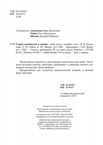 Библиографическое описание: Теория механизмов и машин : учебно-методическое пособие / Сибирский федеральный университет, Институт цветных металлов ; сост.: В. Я. Дьяконова, О. Н. Рябов, Д. Ю. Шакин. - Электрон. текстовые дан. (pdf, 8.2 Мб). - Красноярск : СФУ, 2025 (2025-07-28). - 73 с. - Загл. с титул. экрана. - Библиогр.: с. 72. - Изд. № 2025-24882 : Б. ц. - Текст : электронный.