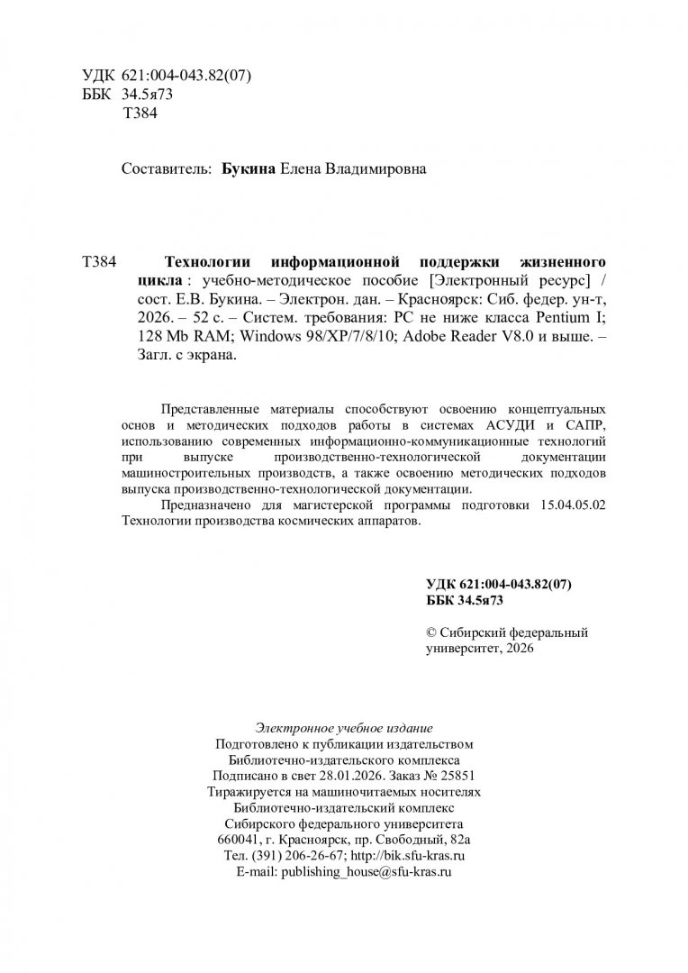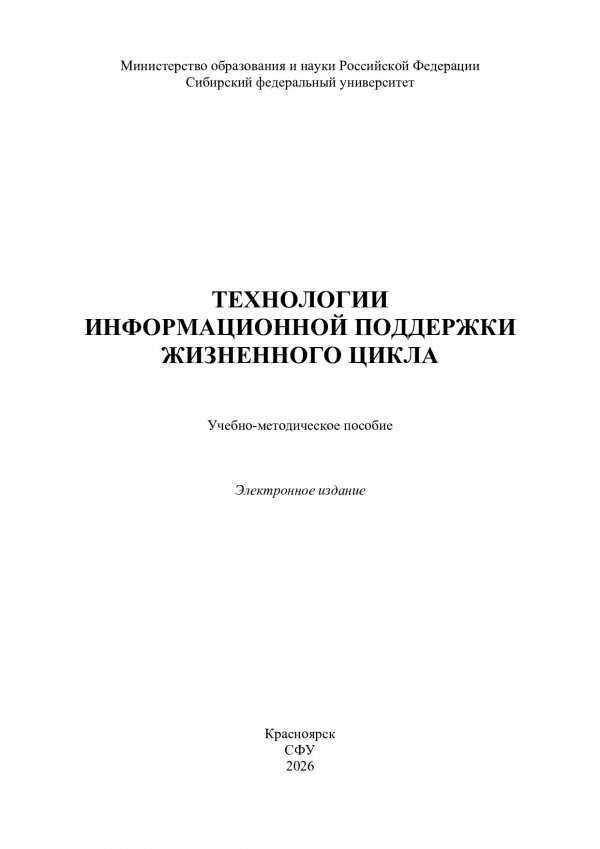 Библиографическое описание:Технологии информационной поддержки жизненного цикла : учебно-методическое пособие / Сиб. федер. ун-т, Политехн. ин-т ; сост. Е. В. Букина. - Электрон. текстовые дан. (pdf, 1 Мб). - Красноярск : СФУ, 2026 (2026-01-28). - 52 с. - Загл. с титул. экрана. - Изд. № 2025-25851 : Б. ц. - Текст : электронный.