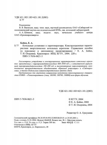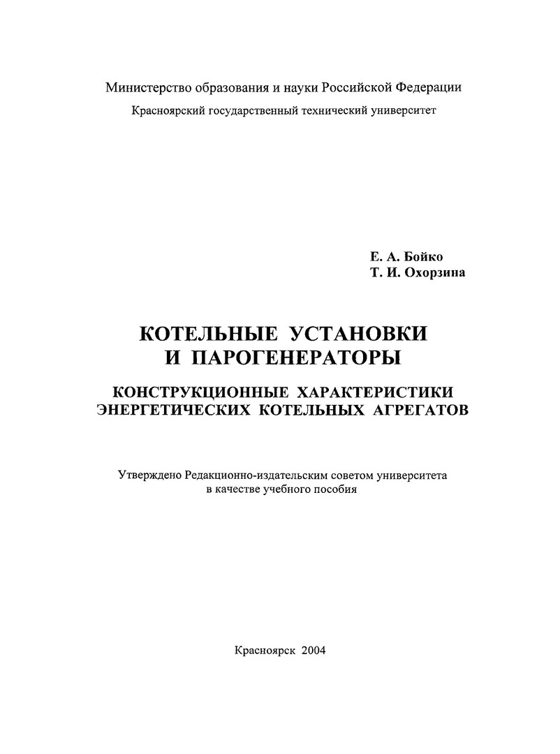 Библиографическое описание:Бойко, Евгений Анатольевич. Котельные установки и парогенераторы. Конструкционные характеристики энергетических котельных агрегатов : учеб. пособие / Е. А. Бойко, Т. И. Охорзина ; Краснояр. гос. техн. ун-т. - Красноярск : ИПЦ КГТУ, 2004. - 228 с. : ил. - Библиогр.: с. 226. - ISBN 5-7636-0621-3. - Текст : непосредственный + Текст : электронный.