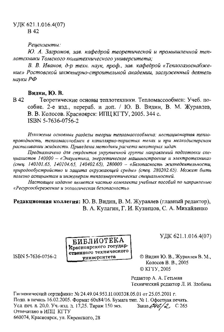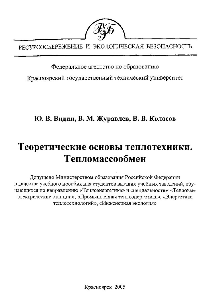 Библиографическое описание: Видин, Юрий Владимирович. Теоретические основы теплотехники. Тепломассообмен : учеб. пособие / Ю. В. Видин, В. М. Журавлев, В. В. Колосов ; Краснояр. гос. техн. ун-т. - 2-е изд., перераб. и доп. - Красноярск : ИПЦ КГТУ, 2005. - 344 с. : ил. - (Ресурсосбережение и экологическая безопасность). - Библиогр.: с. 338-339. - 150 экз. - ISBN 5-7636-0756-2 (в пер.). - Текст : непосредственный + Текст : электронный.