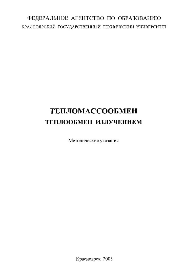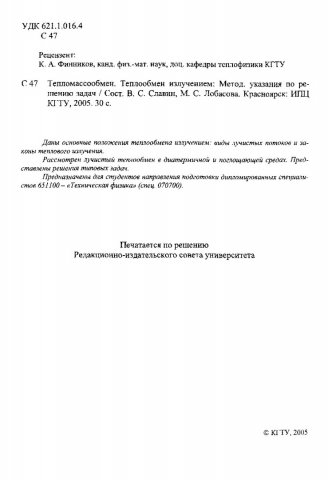 Библиографическое описание:Славин, Вадим Соломонович. Тепломассообмен. Теплообмен излучением : методические указания по решению задач / В. С. Славин, М. С. Лобасова ; Краснояр. гос. техн. ун-т. - Красноярск : ИПЦ КГТУ, 2005. - 30 с. : ил. - (Учеб.- метод. лит.)