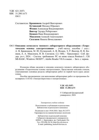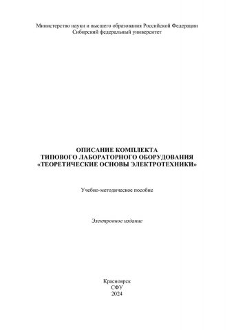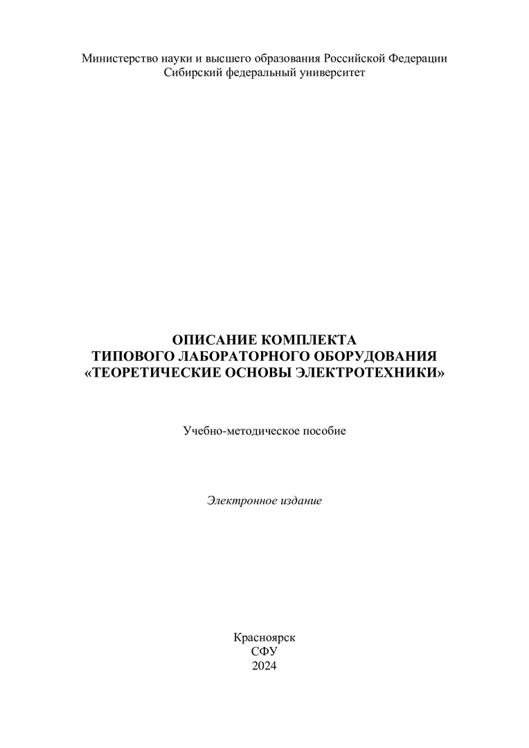 Библиографическое описание:Описание комплекта типового лабораторного оборудования "Теоретические основы электротехники" : учебно-методическое пособие / Сиб. федер. ун-т, Политехн. ин-т ; сост. А. В. Бражников [и др.]. - Электрон. текстовые дан. (pdf, 2,2 Мб). - Красноярск : СФУ, 2024 (2024-04-19). - 35 с. - Загл. с титул. экрана. - Изд. № 2024-21573 : Б. ц. - Текст : электронный.
