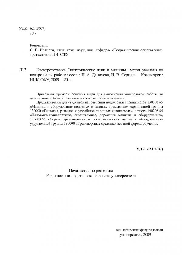 Библиографическое описание: Даничева, Наталья Алексеевна. Электротехника. Электрические цепи и машины : метод. указ. по контр. работе / Н. А. Даничева, Н. В. Сергеев ; Сиб. федер. ун-т. - Красноярск : ИПК СФУ, 2009. - 19 с. : ил. - Библиогр.: с. 18. - 300 экз. - Текст : непосредственный + Текст : электронный.