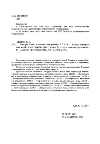 Библиографическое описание:Довгун, Валерий Петрович. Электротехника и основы электроники : учеб. пособие / В. П. Довгун ; Краснояр. гос. техн. ун-т. - Красноярск : ИПЦ КГТУ, 2003 - . - Текст : непосредственный. + Текст : электронный. Ч. 1 : Анализ электронных цепей. - 2003. - 249 с.