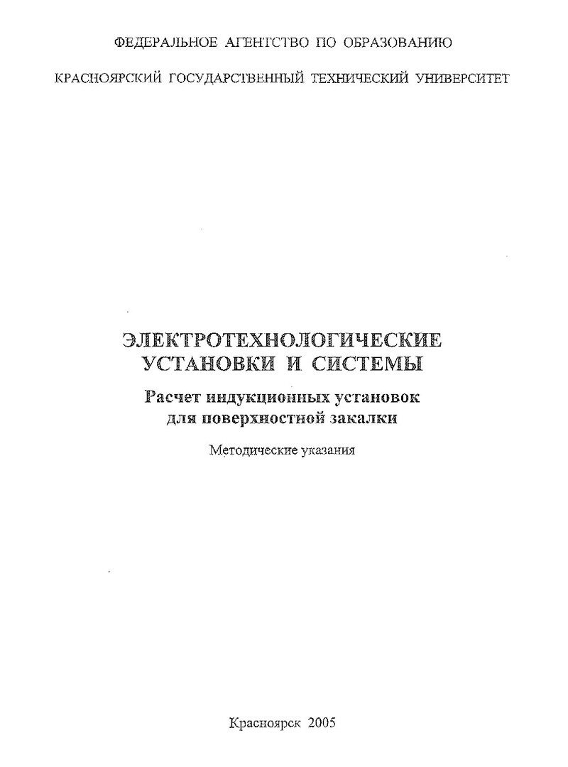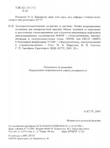 Библиографическое описание:Первухин, Михаил Викторович. Электротехнологические установки и системы. Расчет индукционных установок для поверхностной закалки : Метод. указ. по курсовому и диплом. проектированию для студентов направления подгот. дипломир. спец. 654500 и бакалавров направления 551300 / М. В. Первухин, Н. В. Сергеев, С. П. Тимофеев ; Краснояр. гос. техн. ун-т. - Красноярск : ИПЦ КГТУ, 2005. - 32 с. - (Учебно-методическая литература). - Загл. с титул. экрана. - 100 экз. - Текст : непосредственный + Текст : электронный.