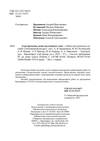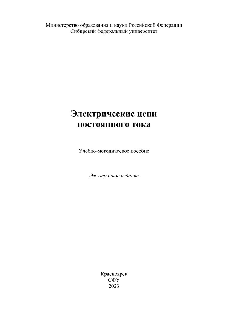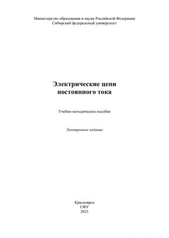 Библиографическое описание: Электрические цепи постоянного тока : учебно-методическое пособие / Сиб. федер. ун-т, Политехн. ин-т ; сост. А. В. Бражников [и др.]. - Электрон. текстовые дан. (pdf, 1,9 Мб). - Красноярск : СФУ, 2023 (2023-10-27). - 57 с. - Загл. с титул. экрана. - Изд. № 2023-20069 : Б. ц. - Текст : электронный.