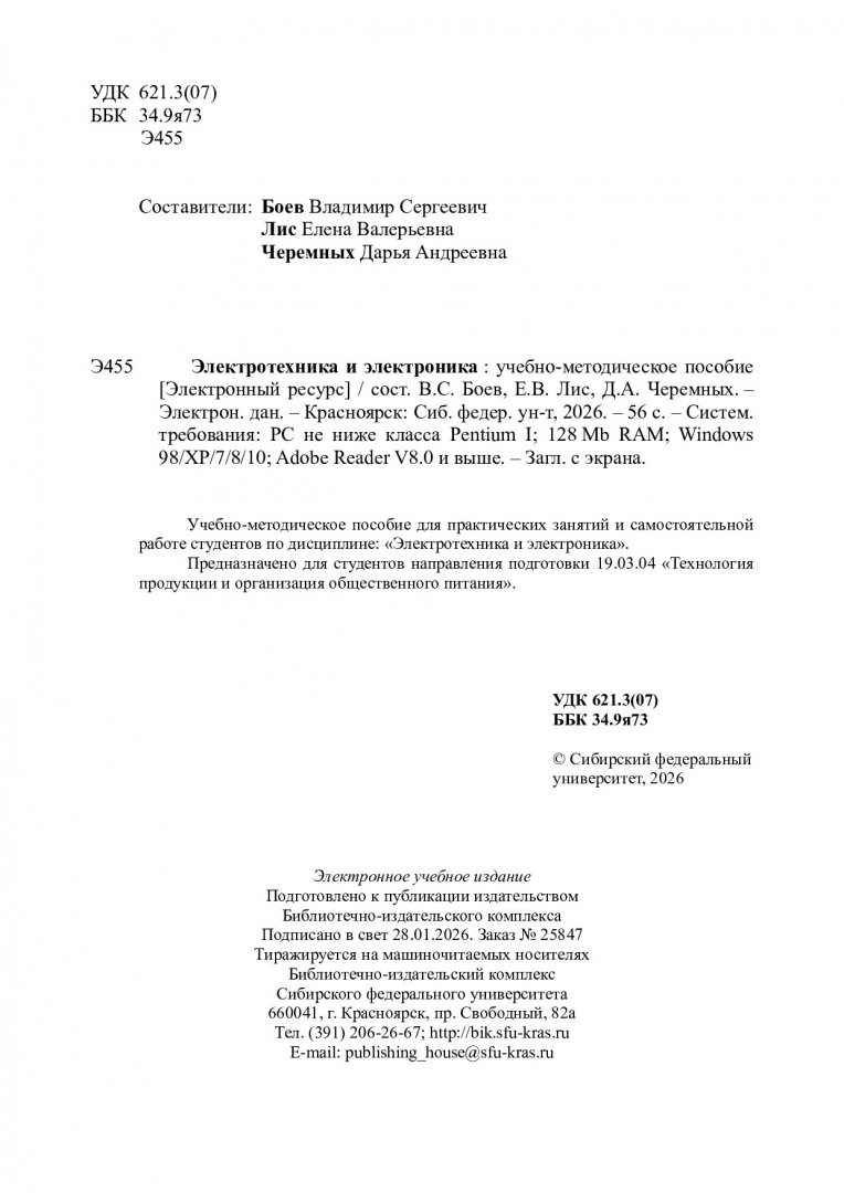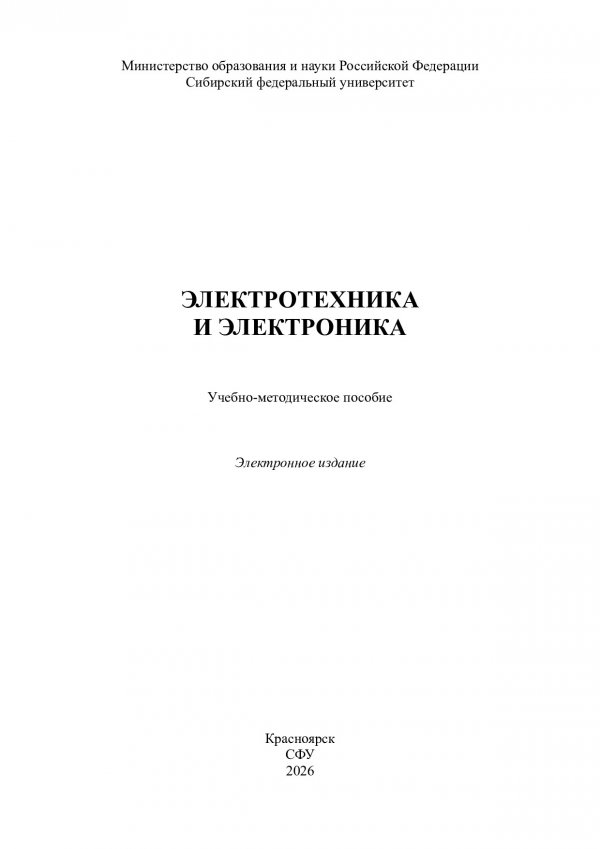 Библиографическое описание: Электротехника и электроника : учебно-методическое пособие / Сибирский федеральный университет, Институт торговли и сферы услуг ; сост.: В. С. Боев, Е. В. Лис, Д. А. Черемных. - Электрон. текстовые дан. (pdf, 1.1 Мб). - Красноярск : СФУ, 2026 (2026-01-28). - 56 с. - Загл. с титул. экрана. - Библиогр.: с. 56. - Изд. № 2025-25847 : Б. ц. - Текст : электронный.