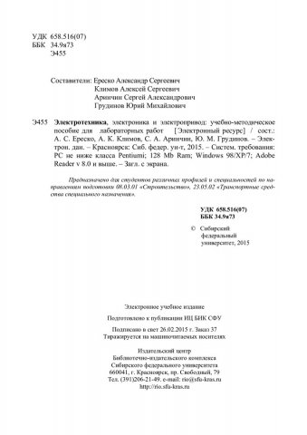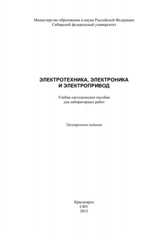 Библиографическое описание:Электротехника, электроника и электропривод : учебно-методическое пособие для лабораторных работ [для студентов напр. 08.03.01 «Строительство», 23.05.02 «Транспортные средства специального назначения»] / Сиб. федер. ун-т, Инж.-строит. ин-т ; сост. А. С. Ереско [и др.]. - Электрон. текст. данные (PDF, 1,9 Мб). - Красноярск : СФУ, 2015. - Загл. с титул. экрана. - Изд. № 2015-37. - Текст : электронный.