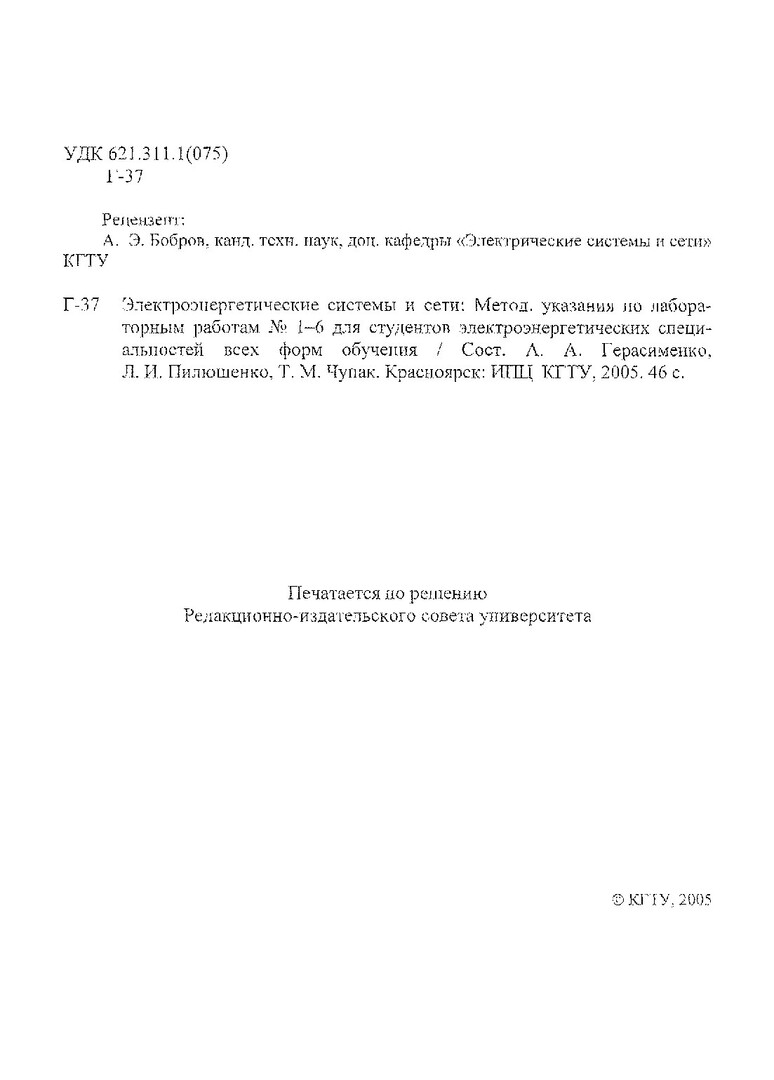 Библиографическое описание:Герасименко, Алексей Алексеевич. Электроэнергетические системы и сети : метод. указ. по лаб. работам №1-6 для студентов электроэнерг. спец. всех форм обучения / А. А. Герасименко, Л. И. Пилюшенко, Т. М. Чупак ; Краснояр. гос. техн. ун-т. - Электрон. текстовые дан. (4,31 Мб). - Красноярск : ИПЦ КГТУ, 2005. - 46 с. - (Учеб.-метод. лит.). - Загл. с титул. экрана. - Текст : непосредственный + Текст : электронный.