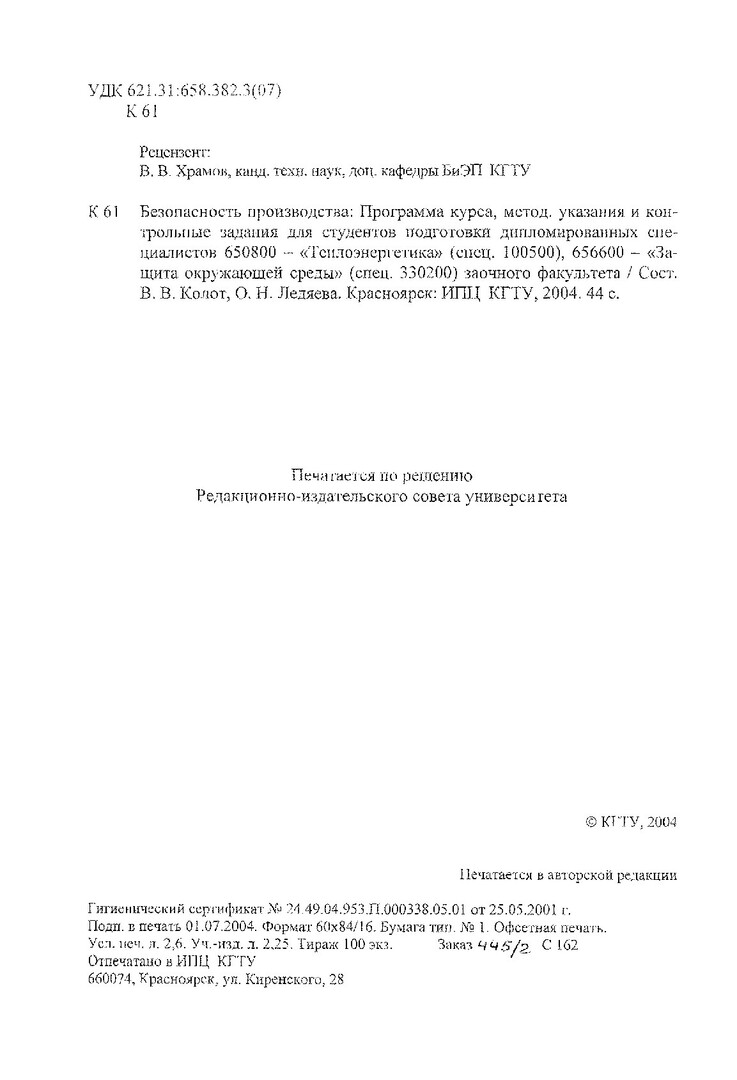 Библиографическое описание:Колот, В. В. Безопасность производства : программа курса, методические указания и контрольные задания для студентов подготовки и дипломирования спец. 650800, 656600 заочного факультета / В. В. Колот, О. Н. Ледяева ; Краснояр. гос. техн. ун-т. - Красноярск : ИПЦ КГТУ, 2004. - 44 с. - Текст : непосредственный + Текст : электронный.