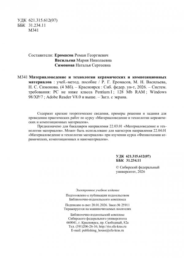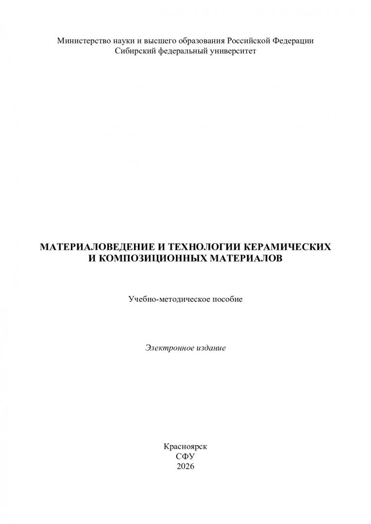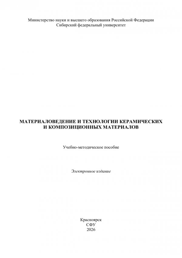 Библиографическое описание:Материаловедение и технологии керамических и композиционных материалов : учебно-методическое пособие / Сиб. федер. ун-т, Ин-т цветных металлов ; сост.: Р. Г. Еромасов, М. Н. Васильева, Н. С. Симонова. - Электрон. текстовые дан. (pdf, 8.8 Мб). - Красноярск : СФУ, 2026 (2026-01-20). - 130 с. - Загл. с титул. экрана. - Изд. № 2025-25911 : Б. ц. - Текст : электронный.
