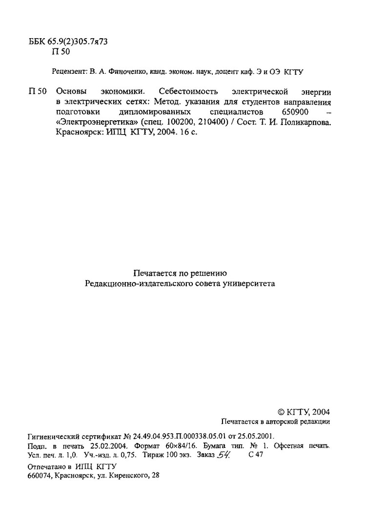 Библиографическое описание:Поликарпова, Татьяна Ивановна. Основы экономики. Себестоимость электрической энергии в электрических сетях : метод. указ. для студентов напр. подг. дипломир. спец. 650900- "Электроэнергетика" (спец. 100200, 210400) / Т. И. Поликарпова ; Краснояр. гос. техн. ун-т. - Красноярск : ИПЦ КГТУ, 2004. - 16 с. - Текст : непосредственный + Текст : электронный.