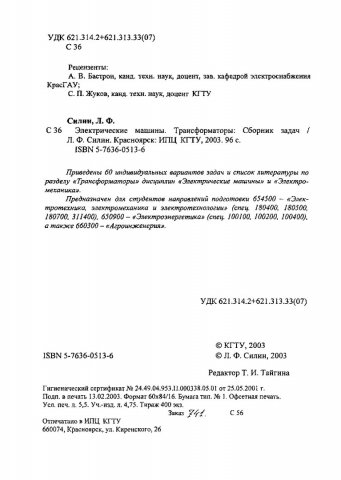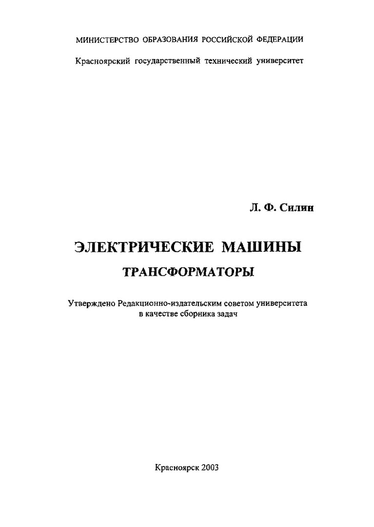 Библиографическое описание:Силин, Леонид Федорович. Электрические машины. Трансформаторы : сб. задач / Л. Ф. Силин ; Краснояр. гос. техн. ун-т. - Красноярск : ИПЦ КГТУ, 2003. - 96 с. - ISBN 5-7636-0513-6 : 11.00 р. - Текст : непосредственный + Текст : электронный.