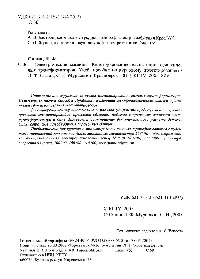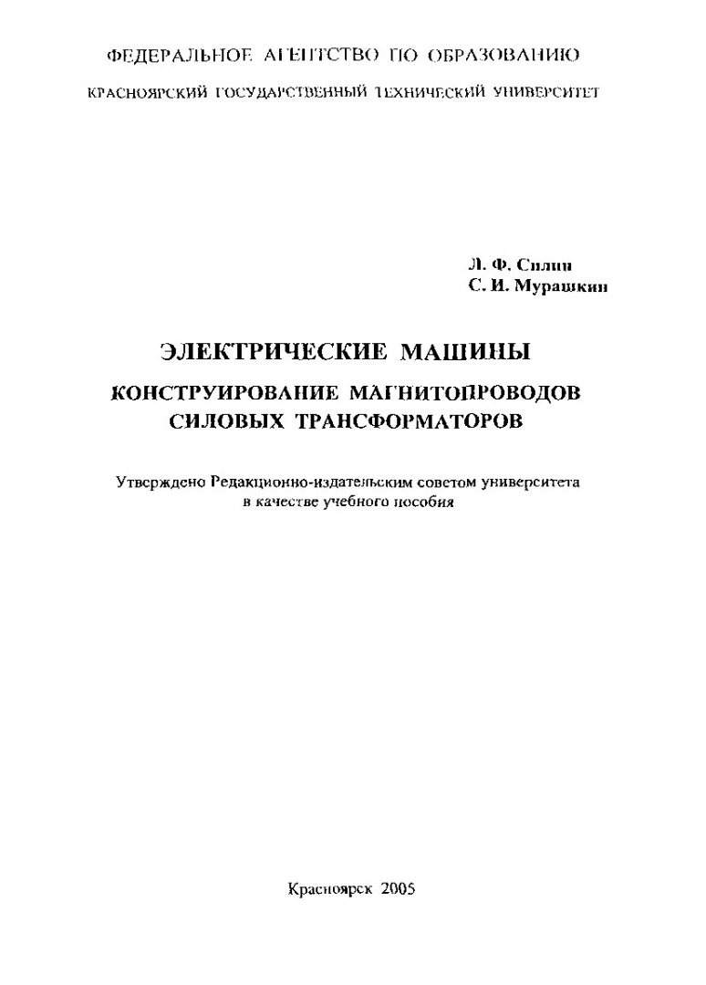 Библиографическое описание: Силин, Леонид Федорович. Электрические машины. Конструирование магнитопроводов силовых трансформаторов : учеб. пособие / Л. Ф. Силин, С. И. Мурашкин ; Краснояр. гос. техн. ун-т. - Красноярск : ИПЦ КГТУ, 2005. - 82 с. : ил. - (Учебное пособие). - Библиогр.: с. 81. - Текст : непосредственный + Текст : электронный.