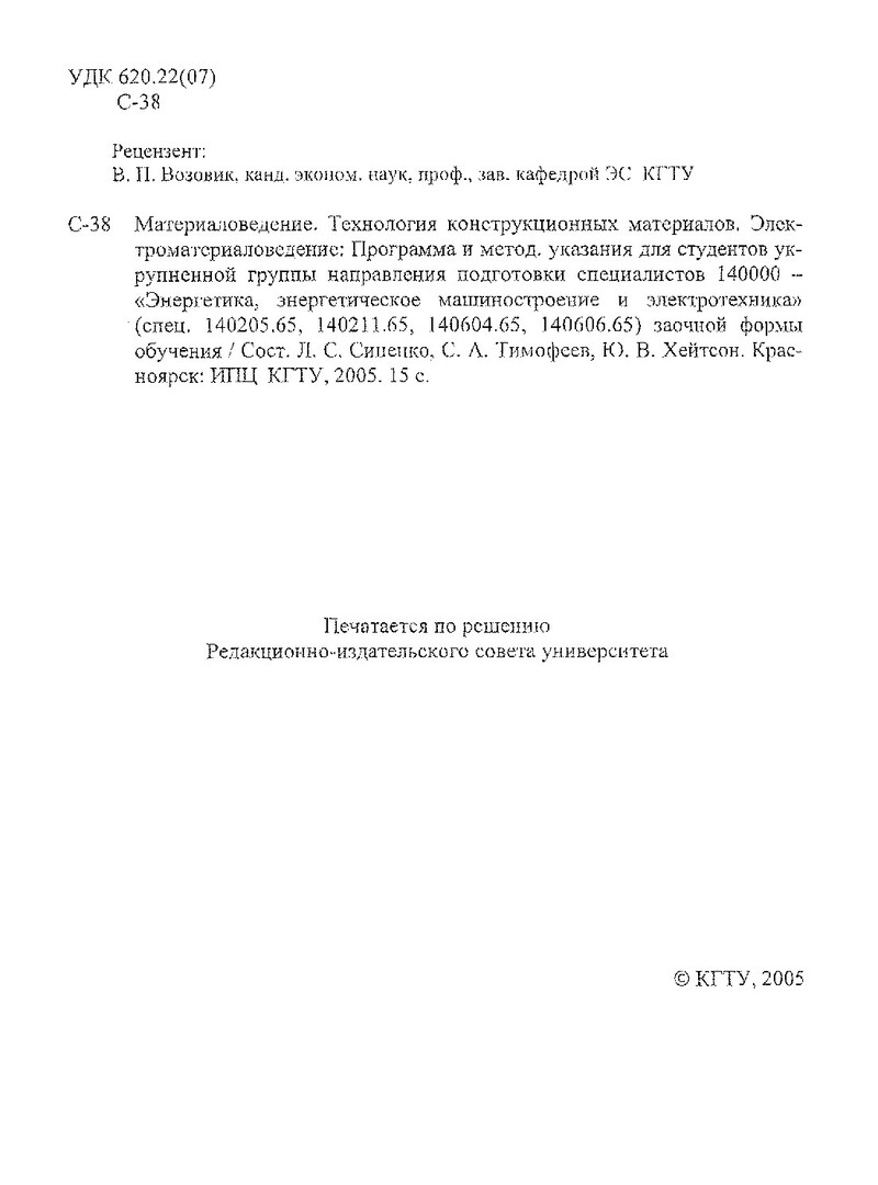 Библиографическое описание:Синенко, Людмила Соломоновна. Материаловедение. Технология конструкционных материалов. Электроматериаловедение : программа и метод. указ. для студентов укрупн. гр. напр. подг. спец. 140000 заоч. формы обучения / Л. С. Синенко, С. А. Тимофеев, Ю. В. Хейтсон ; Краснояр. гос. техн. ун-т. - Электрон. текстовые дан. (1,23 Мб). - Красноярск : ИПЦ КГТУ, 2005. - 15 с. : ил. - (Учебно-методическая литература). - Загл. с титул. экрана. - Электрон. версия печ. публикации . - 9.00 р. - Текст : электронный.