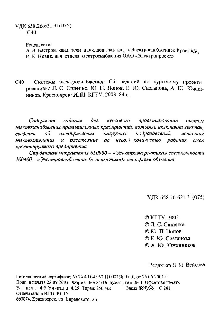 Библиографическое описание:Системы электроснабжения : сб. заданий по курсовому проектированию / Л. С. Синенко, Ю. П. Попов, Е. Ю. Сизганова, А. Ю. Южанников ; КГТУ. - Красноярск : ИПЦ КГТУ, 2003. - 84 с. - Текст : непосредственный + Текст : электронный.