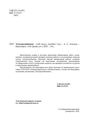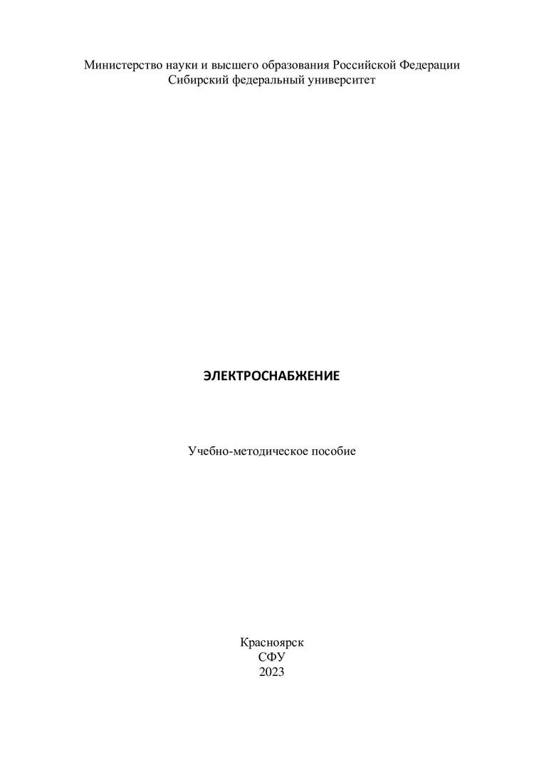 Библиографическое описание: Электроснабжение : учебно-методическое пособие / Сибирский федеральный университет ; сост. А. С. Амузаде. - Электрон. текстовые дан. (1,3 Мб). - Красноярск : СФУ, 2023 (2023-12-20). - 24 с. : ил. - Загл. с титул. экрана. - Электрон. версия печ. публикации . - Библиогр.: с. 21. - 100 экз. - Изд. № 2023-20653 : Б. ц. - Текст : электронный.