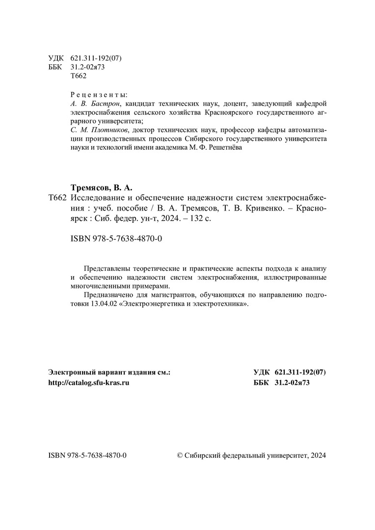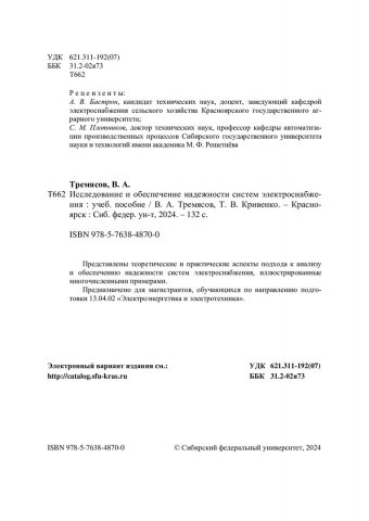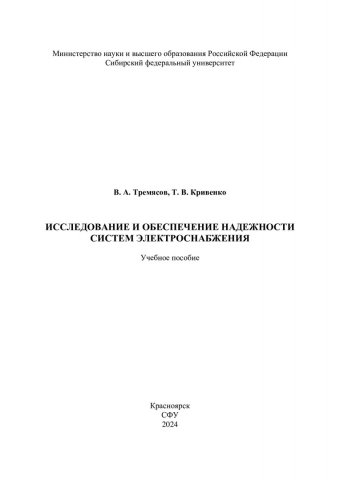 Библиографическое описание: Тремясов, Владимир Анатольевич. Исследование и обеспечение надежности систем электроснабжения : учебное пособие / В. А. Тремясов, Т. В. Кривенко ; Сибирский федеральный университет, Политехнический институт. - Электрон. текстовые дан. (3,4 Мб). - Красноярск : СФУ, 2024 (2024-09-05). - 132 с., 8.2 усл. печ. л. : граф., схемы, табл. - Загл. с титул. экрана. - Электрон. версия печ. публикации . - Библиогр.: с. 129-130. - 100 экз. - ISBN 978-5-7638-4870-0 : Б. ц. - Изд. № 2023-19793. - Текст : электронный.