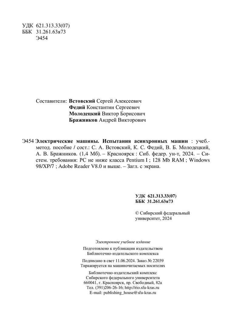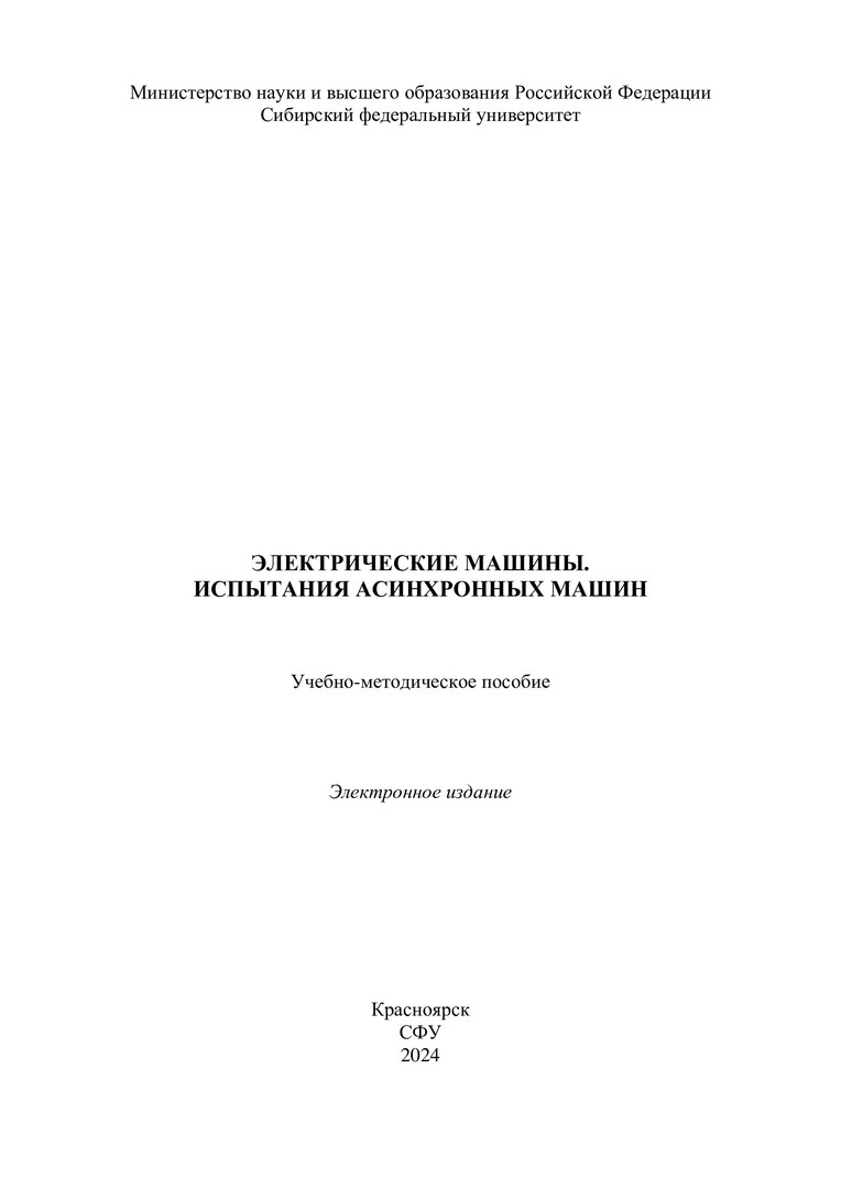 Библиографическое описание:Электрические машины. Испытания асинхронных машин : учебно-методическое пособие / Сиб. федер. ун-т, Политехн. ин-т ; сост. С. А. Встовский [и др.]. - Электрон. текстовые дан. (pdf, 1,5 Мб). - Красноярск : СФУ, 2024 (2024-06-11). - 43 с. - Загл. с титул. экрана. - Изд. № 2024-22039 : Б. ц. - Текст : электронный.