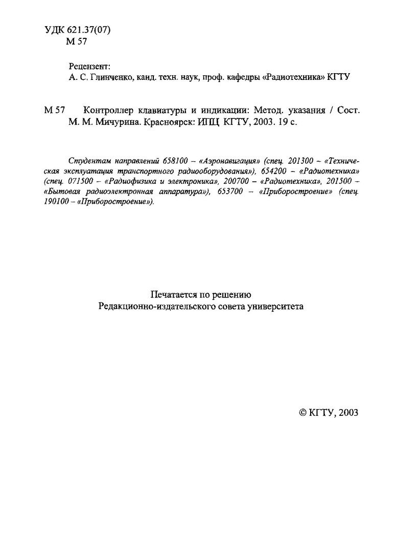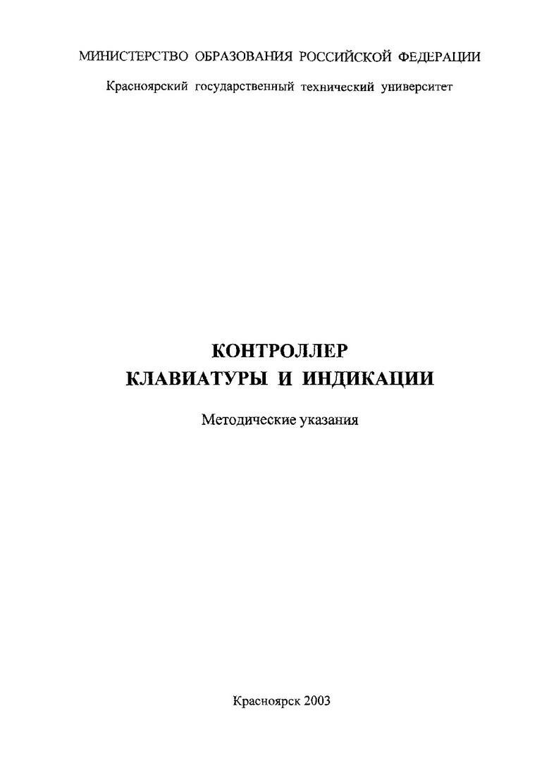 Мичурина, Маргарита Михайловна. Контроллер клавиатуры и индикации : методические указания / М. М. Мичурина ; Краснояр. гос. техн. ун-т. - Красноярск : ИПЦ КГТУ, 2003. - 19 с. - Текст : непосредственный + Текст : электронный.