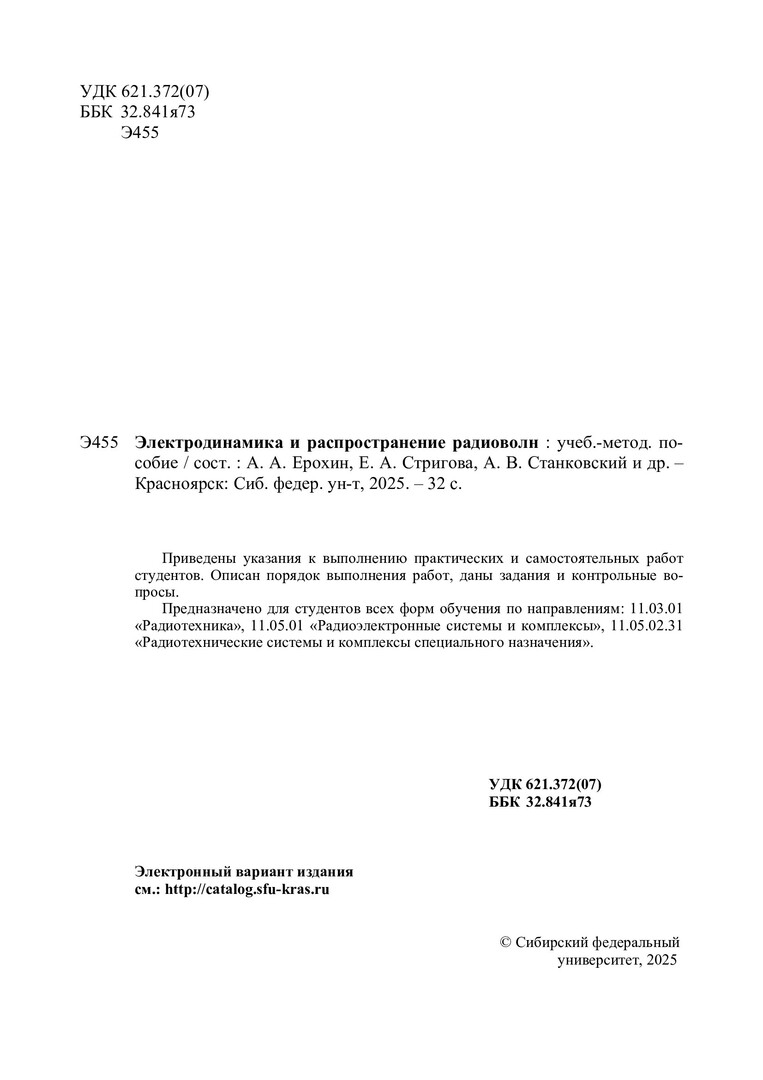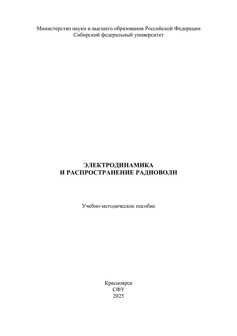 Библиографическое описание:Электродинамика и распространение радиоволн : учебно-методическое пособие [к выполнению практических и самостоятельных работ] / Сибирский федеральный университет ; сост.: А. А. Ерохин, Е. А. Стригова, А. В. Станковский [и др.]. - Электрон. текстовые дан. (3,5 Мб). - Красноярск : СФУ, 2025 (2025-02-19). - 32 с. - Загл. с титул. экрана. - Электрон. версия печ. публикации . - Библиогр.: с. 28. - 100 экз. - Изд. № 2025-23802 : Б. ц. - Текст : электронный.
